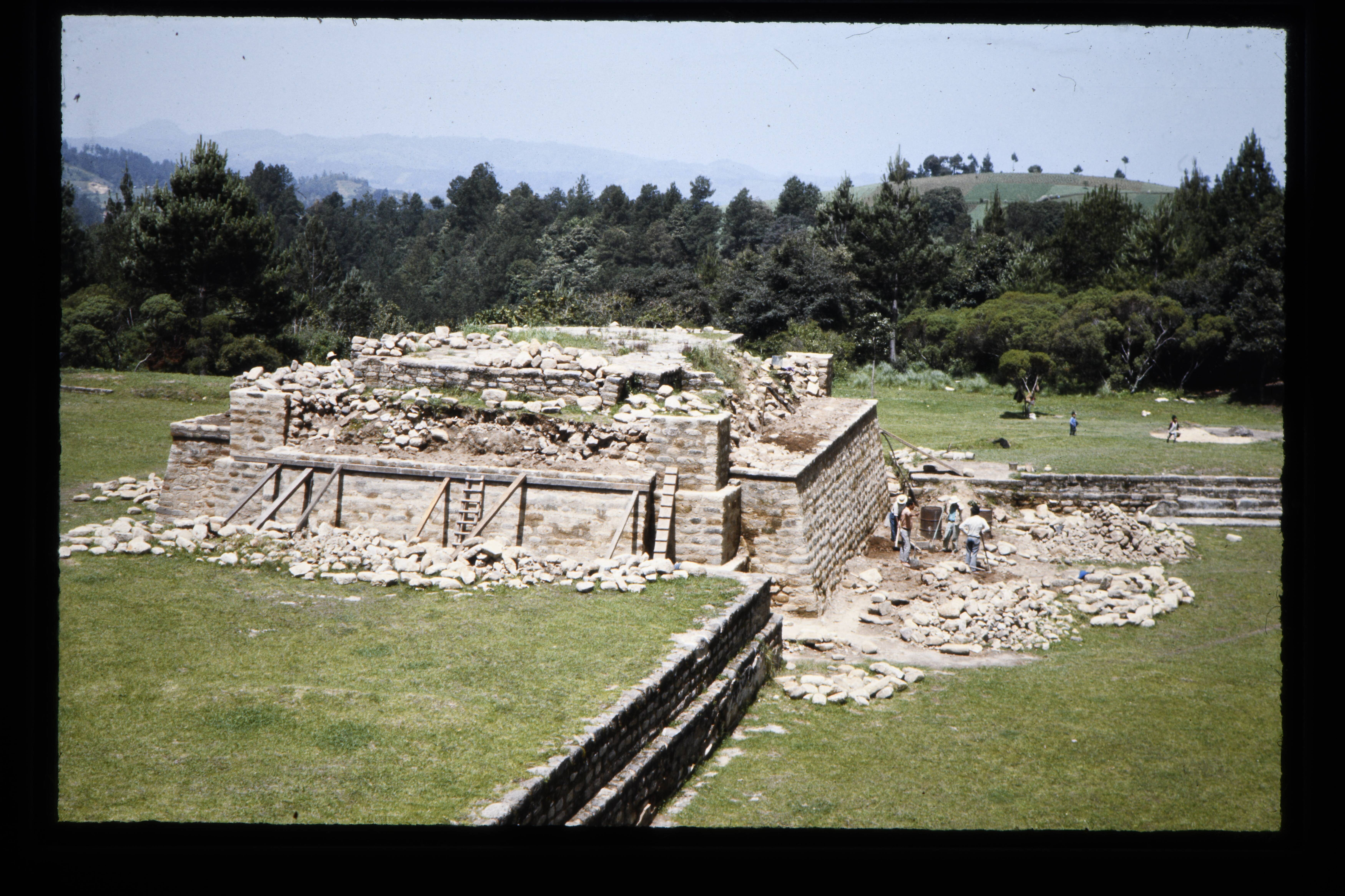 'Lximche, ruïnes van het oude "Indiaanse" Cakchiquel koninkrijk, gebouwd in 1470 en in 1525 door Pedro de Alvarado verwoest.'