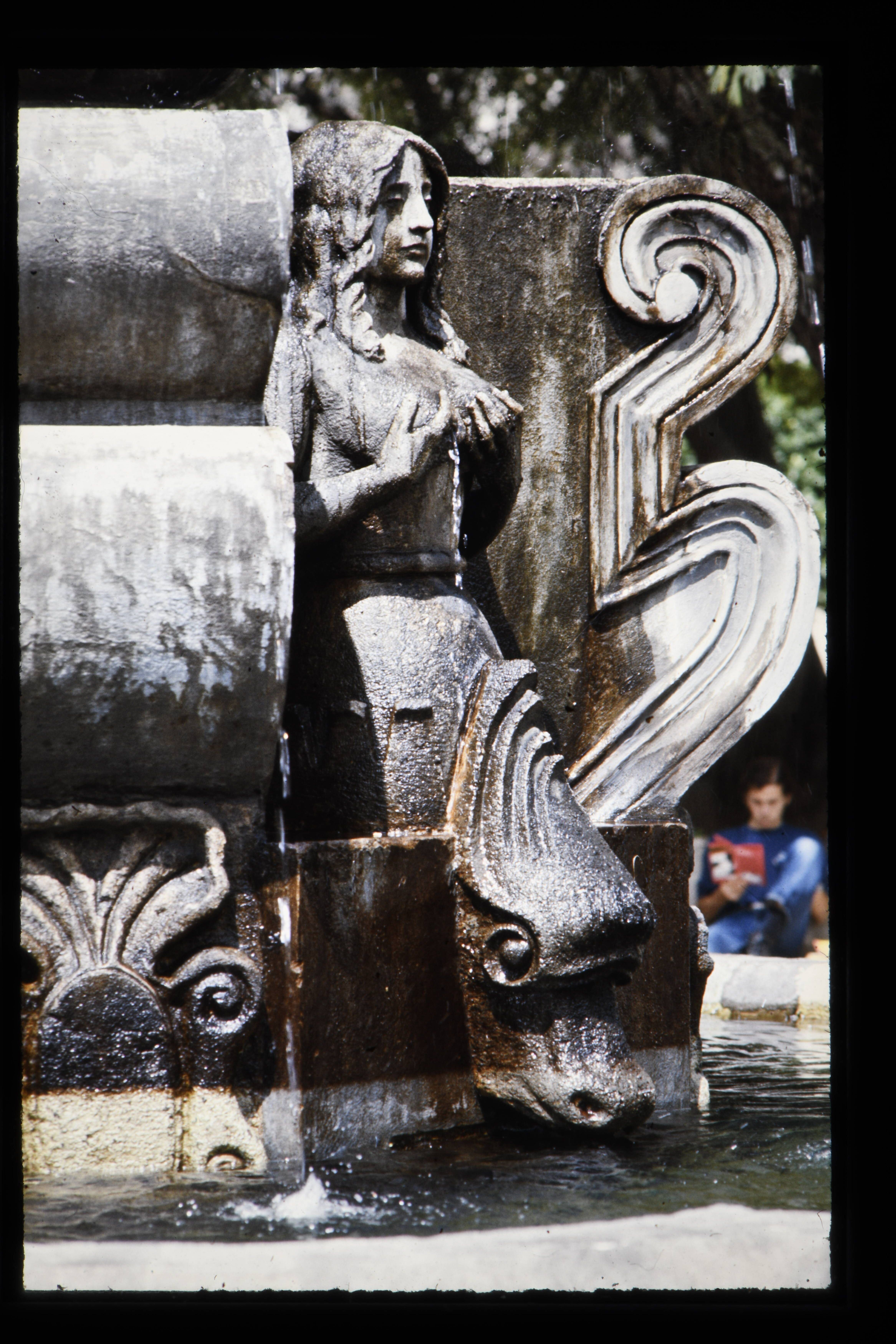 'Fontein van de drie sirenen op de Plaza Mayor o Real (of plaza des Armas) te Antigua (gebouwd in 1739).'