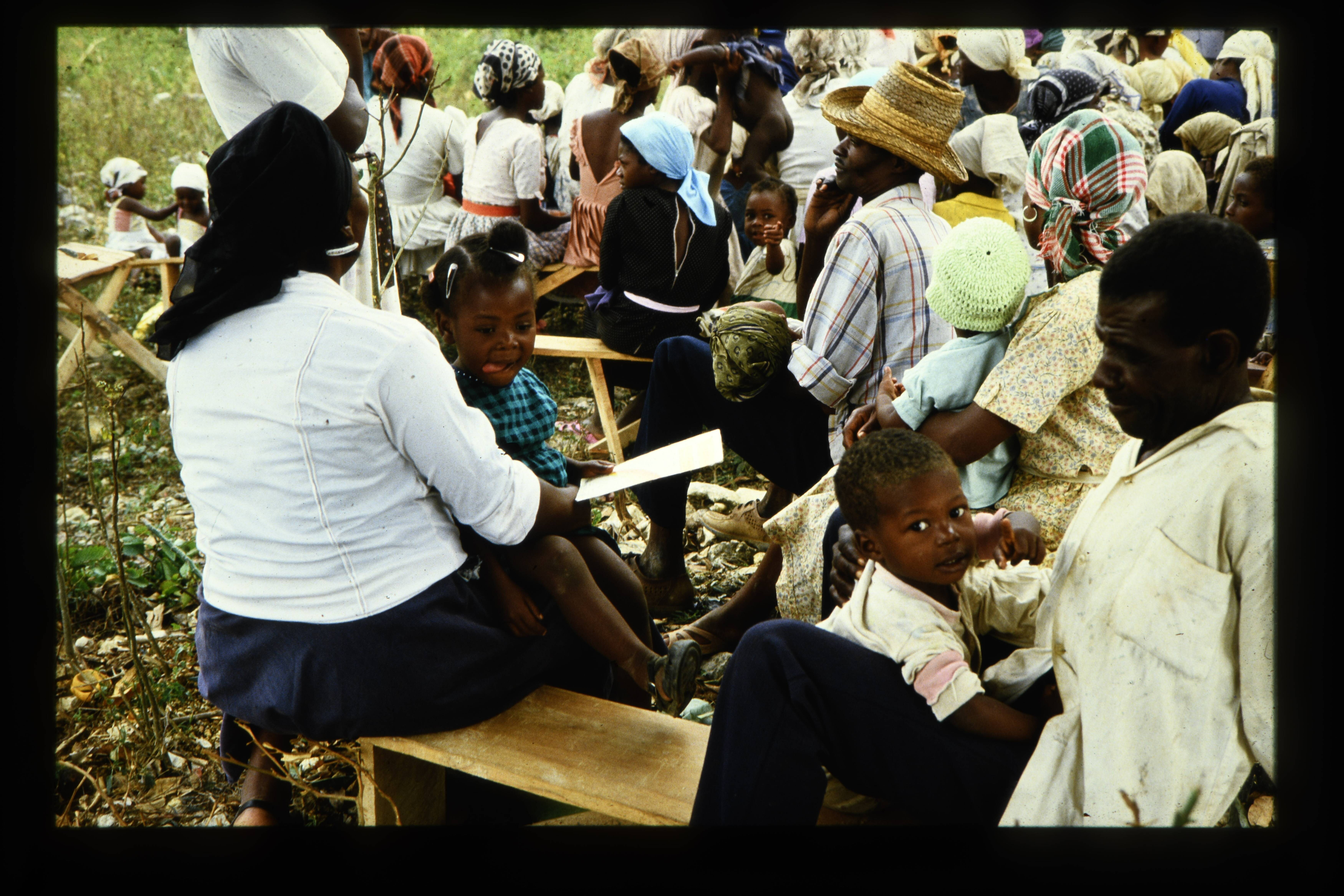 'Wachtende mensen bij een kliniek in het binnen­land van Haïti.'