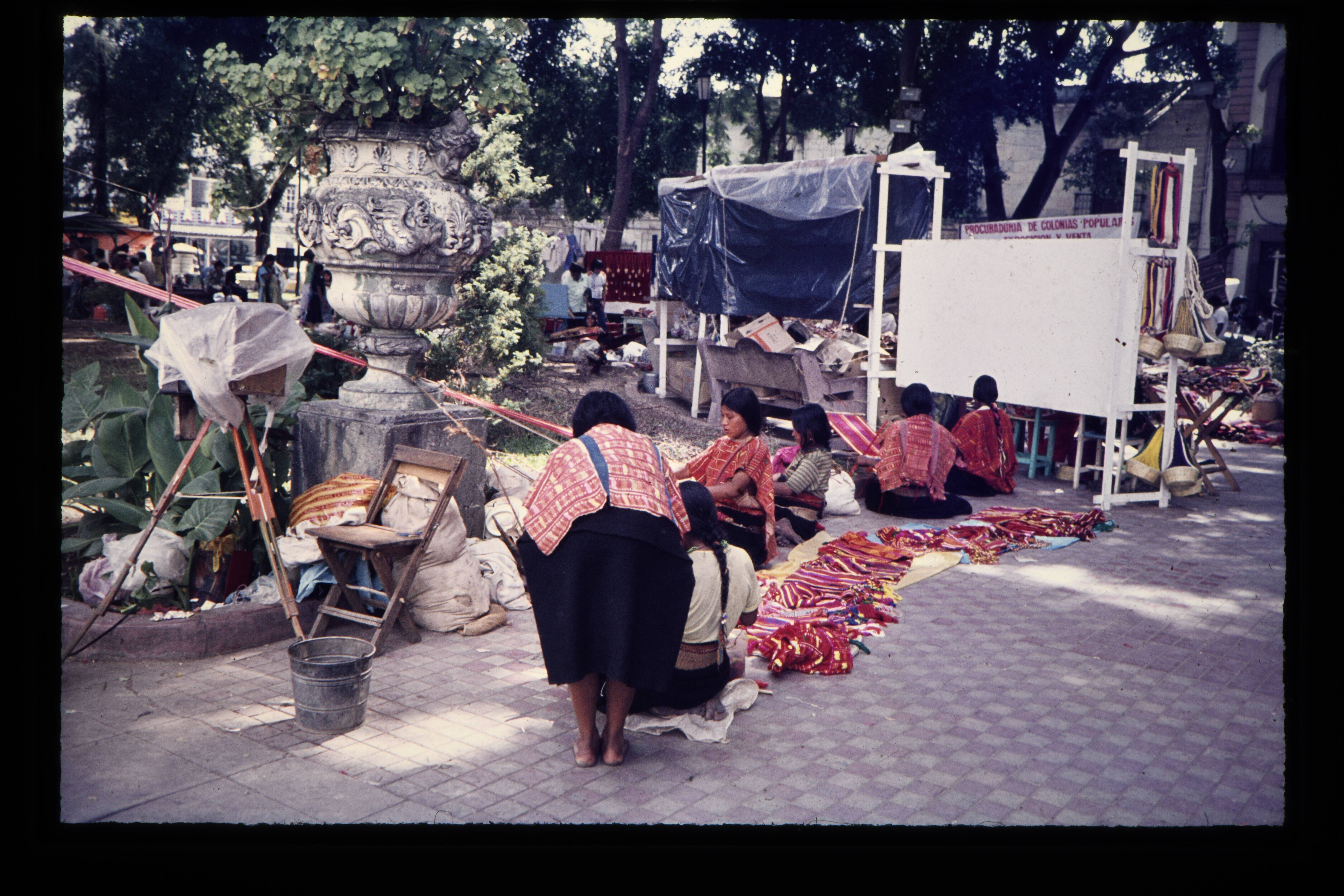 'Vrouwen aan het weven met het heupweefgetouw.'