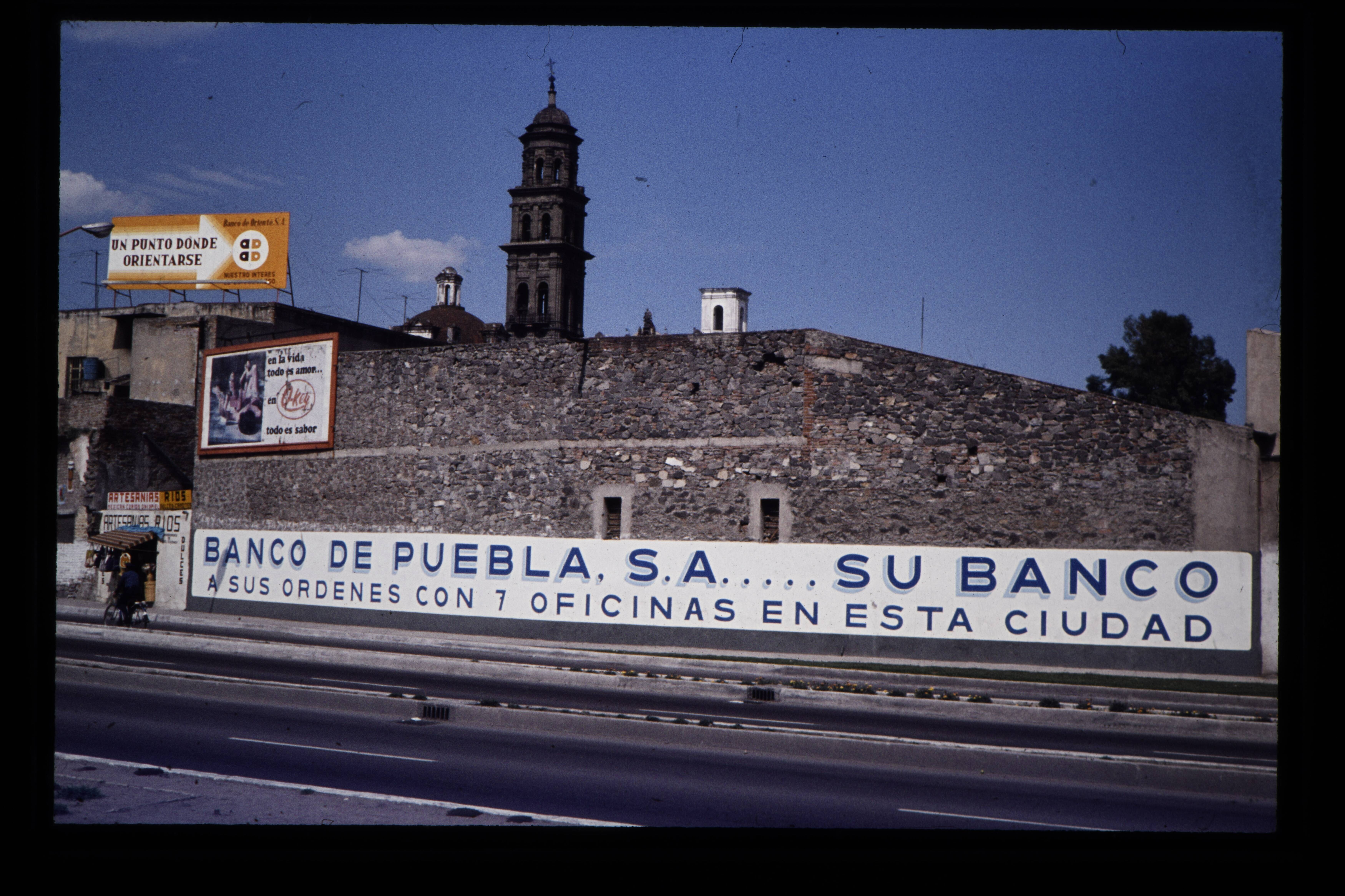 'De Stad Puebla met reclameborden. '