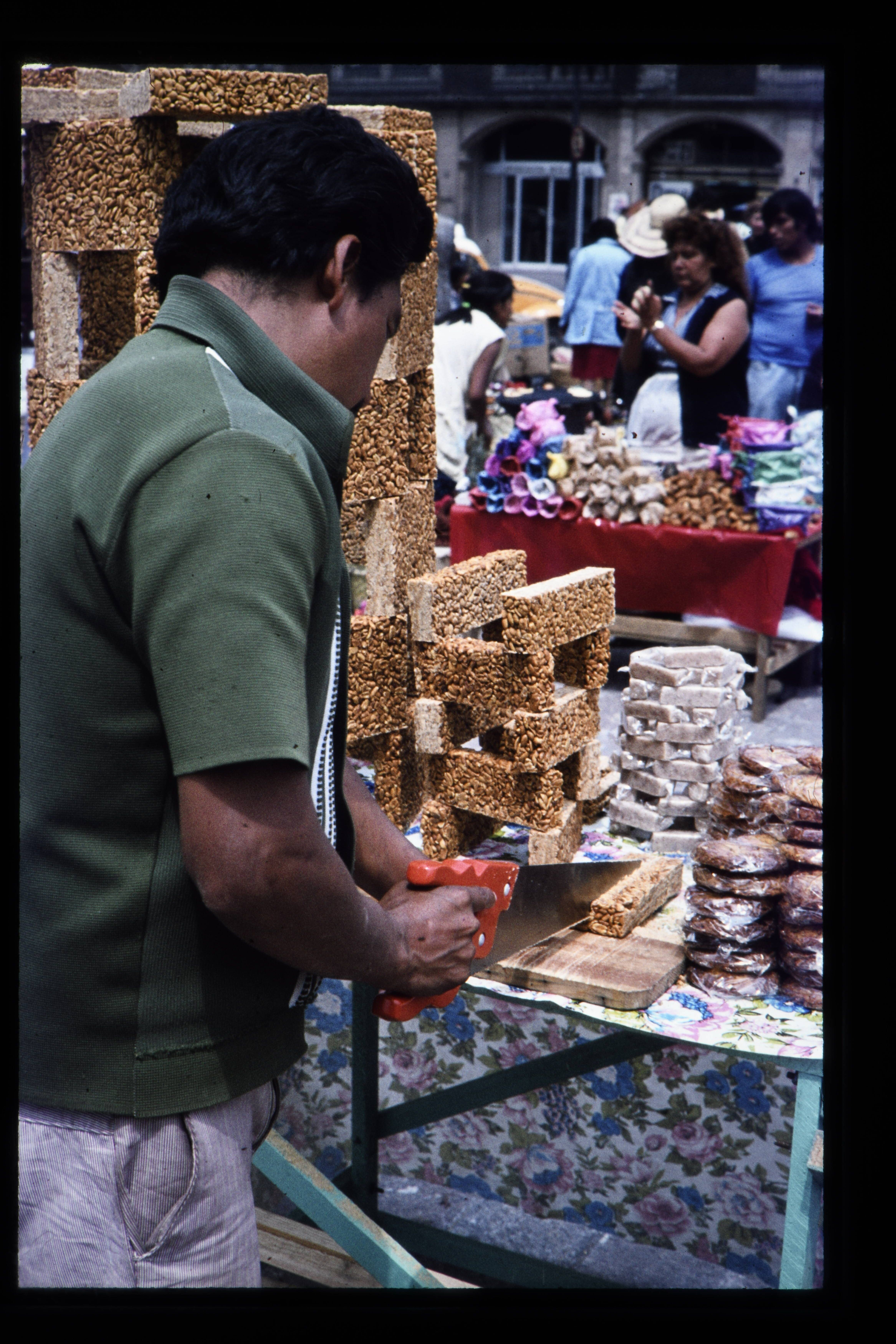 'Verkoop van snoepgoed tijdens de Fiesta de Mulitas bij de Kathedraal in Mexico-Stad.'