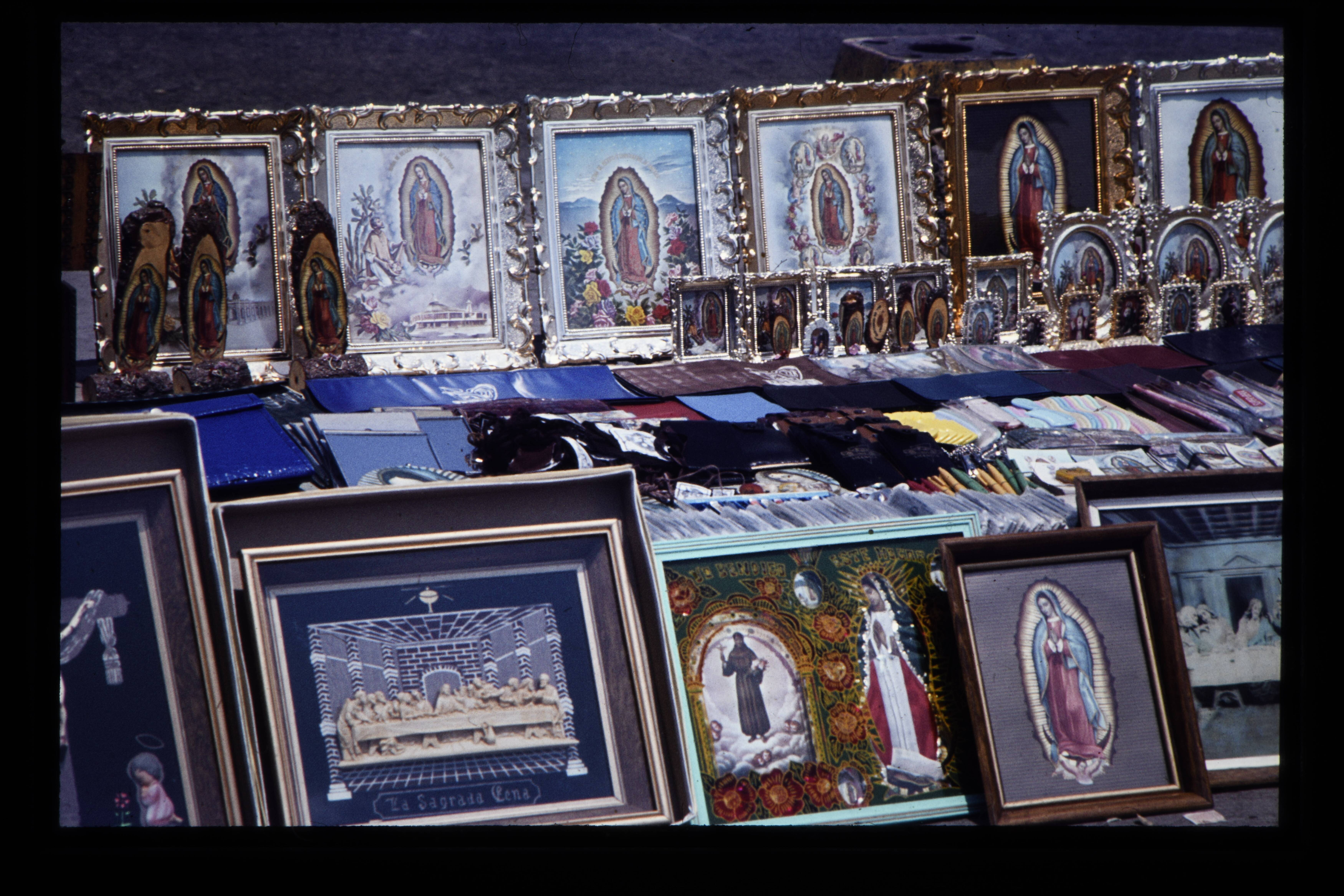 'Verkoop van heilige beeldjes en heilige prentjes op de terreinen van de Basílica de Nuestro Señora de Guadalupe te Mexico-Stad.'