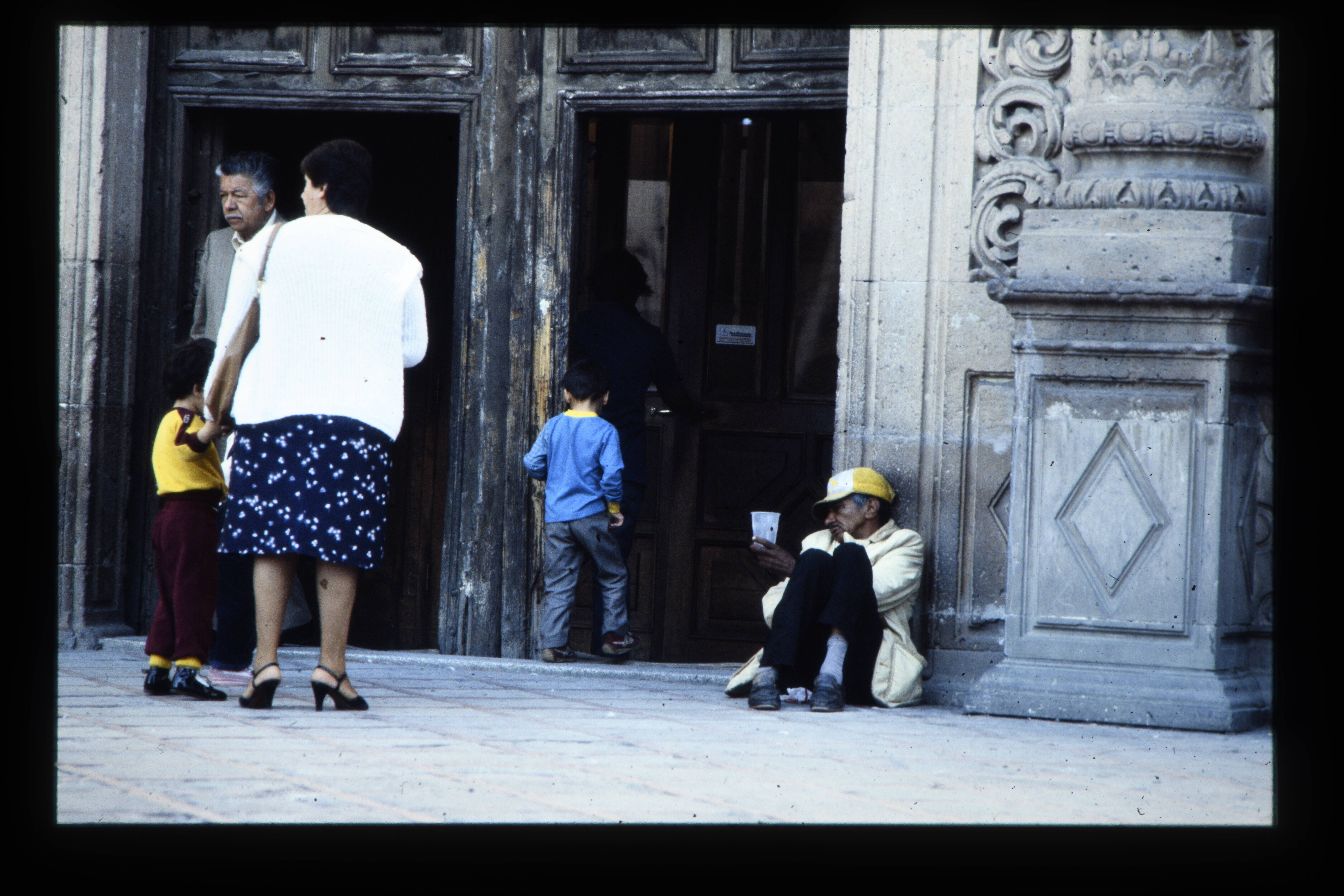 'Detail kathedraal in Chihuahua, bedelaar aan ingang.'