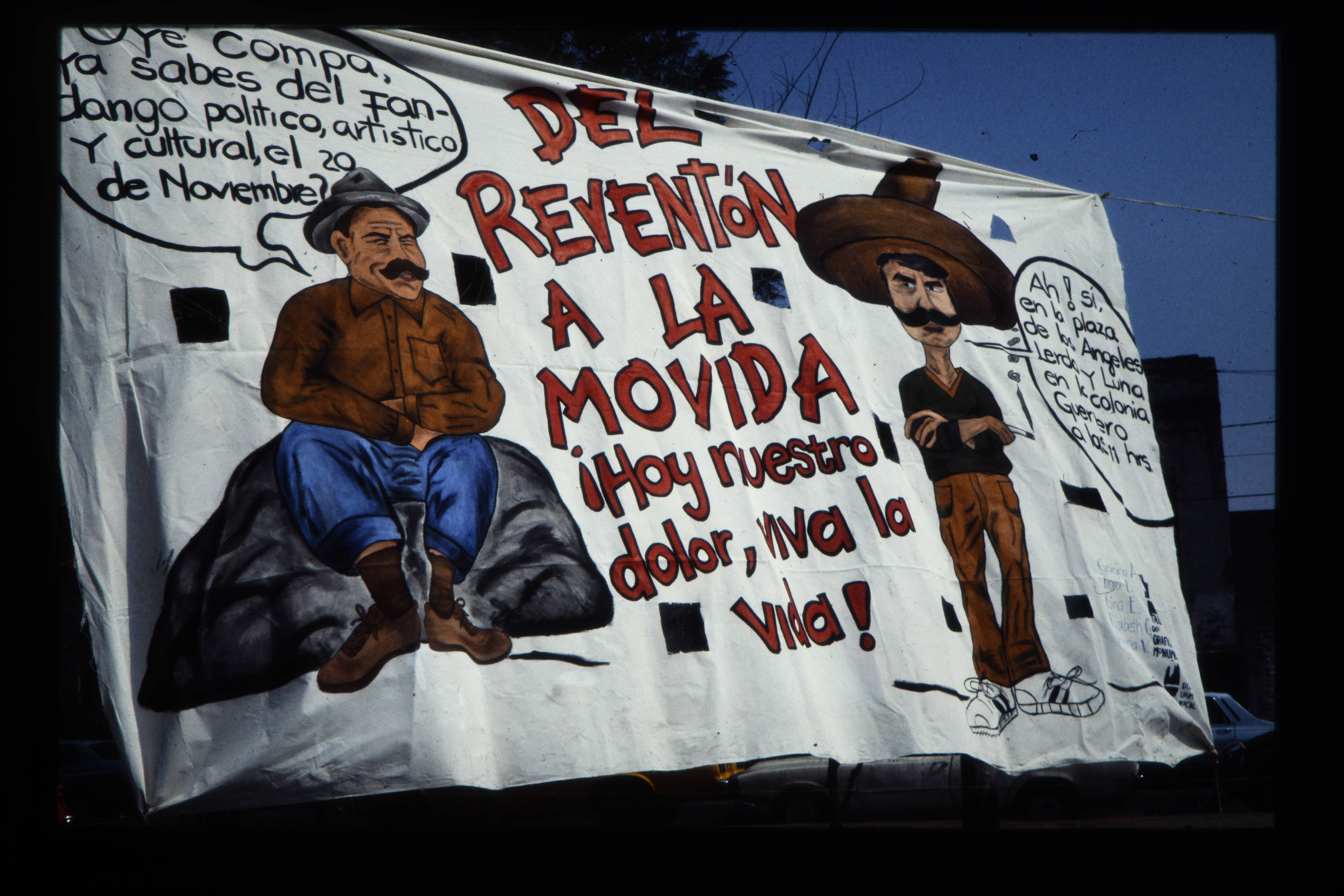 'Dag van de revolutie, alternatieve feest in volkswijk Colonia Guerrero. Manifestatie en protest­ bijeenkomst en ondersteuning van aardbevingsramp. Mexico-stad.'