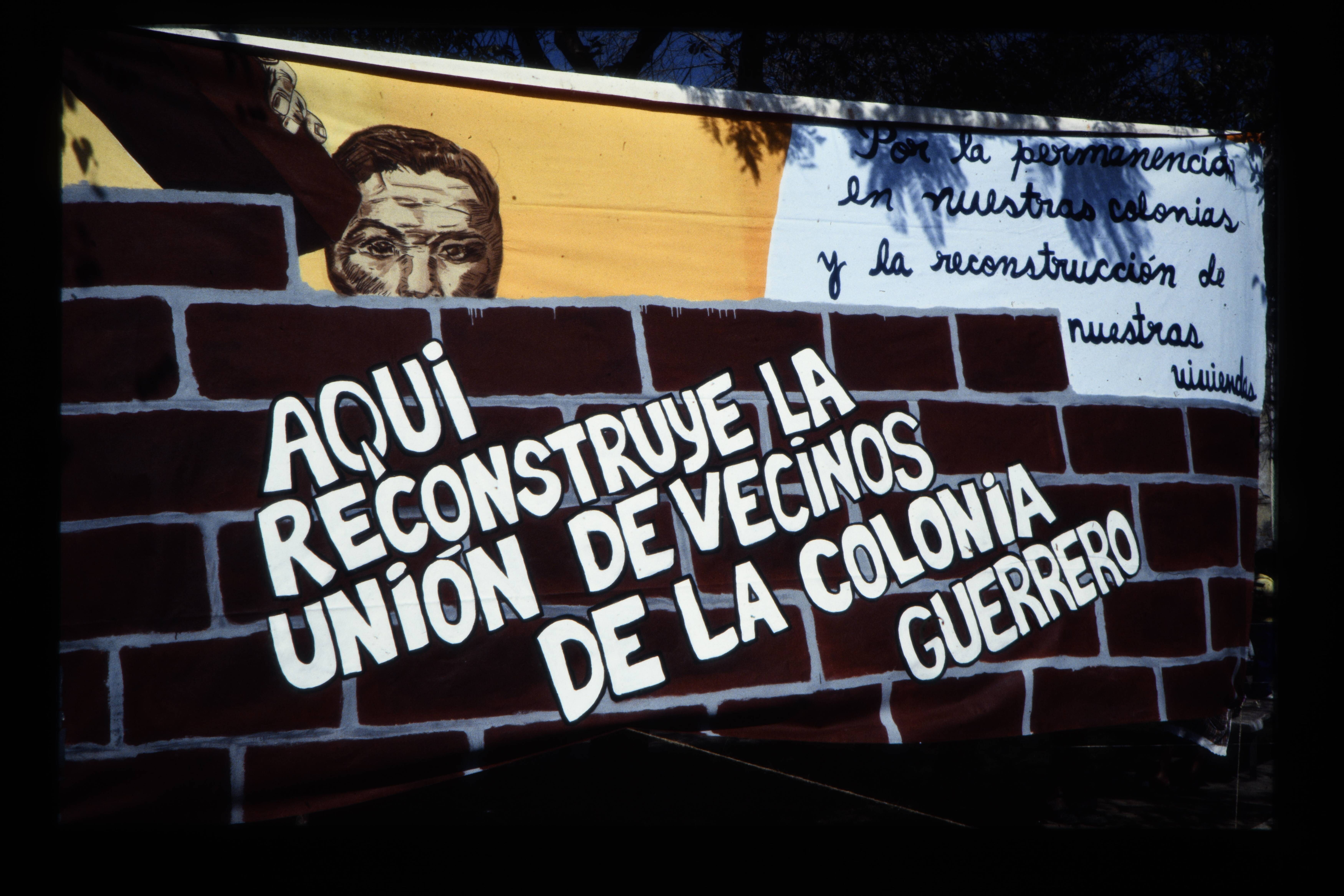 'Dag van de revolutie, alternatieve feest in volkswijk Colonia Guerrero. Manifestatie en protest­ bijeenkomst en ondersteuning van aardbevingsramp. Mexico-stad.'