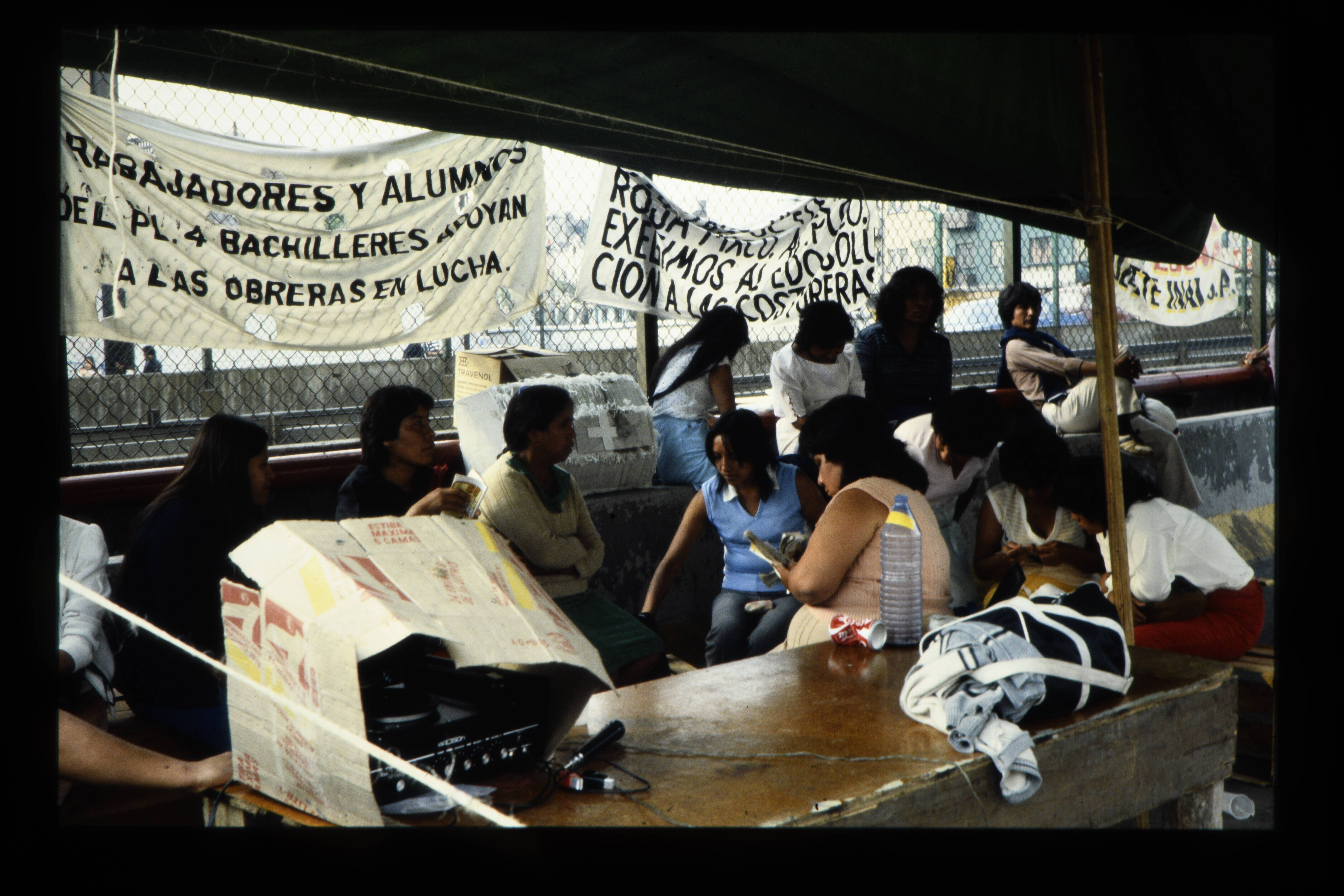'Straat San Antonio Abad. Naaisters vakbond zetten straaten af ter voorkoming van leeghalen fabriekjes, die gedeeltelijk verwoest zijn door aardbeving. Veel naaisters zijn omgekomen tijdens aardbeving.'
