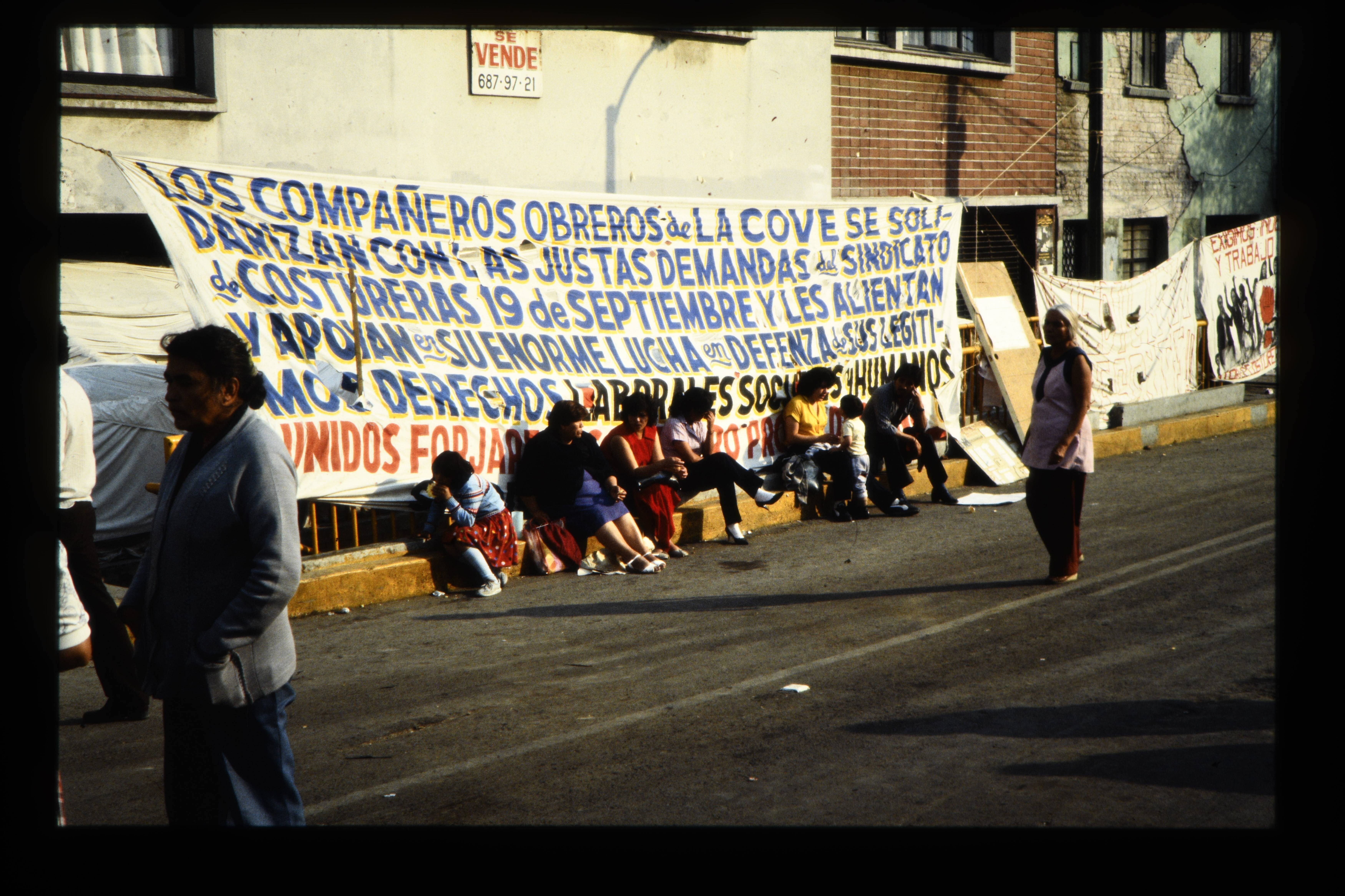 'Straat San Antonio Abad. Naaisters vakbond zetten straaten af ter voorkoming van leeghalen fabriekjes, die gedeeltelijk verwoest zijn door aardbeving. Veel naaisters zijn omgekomen tijdens aardbeving.'