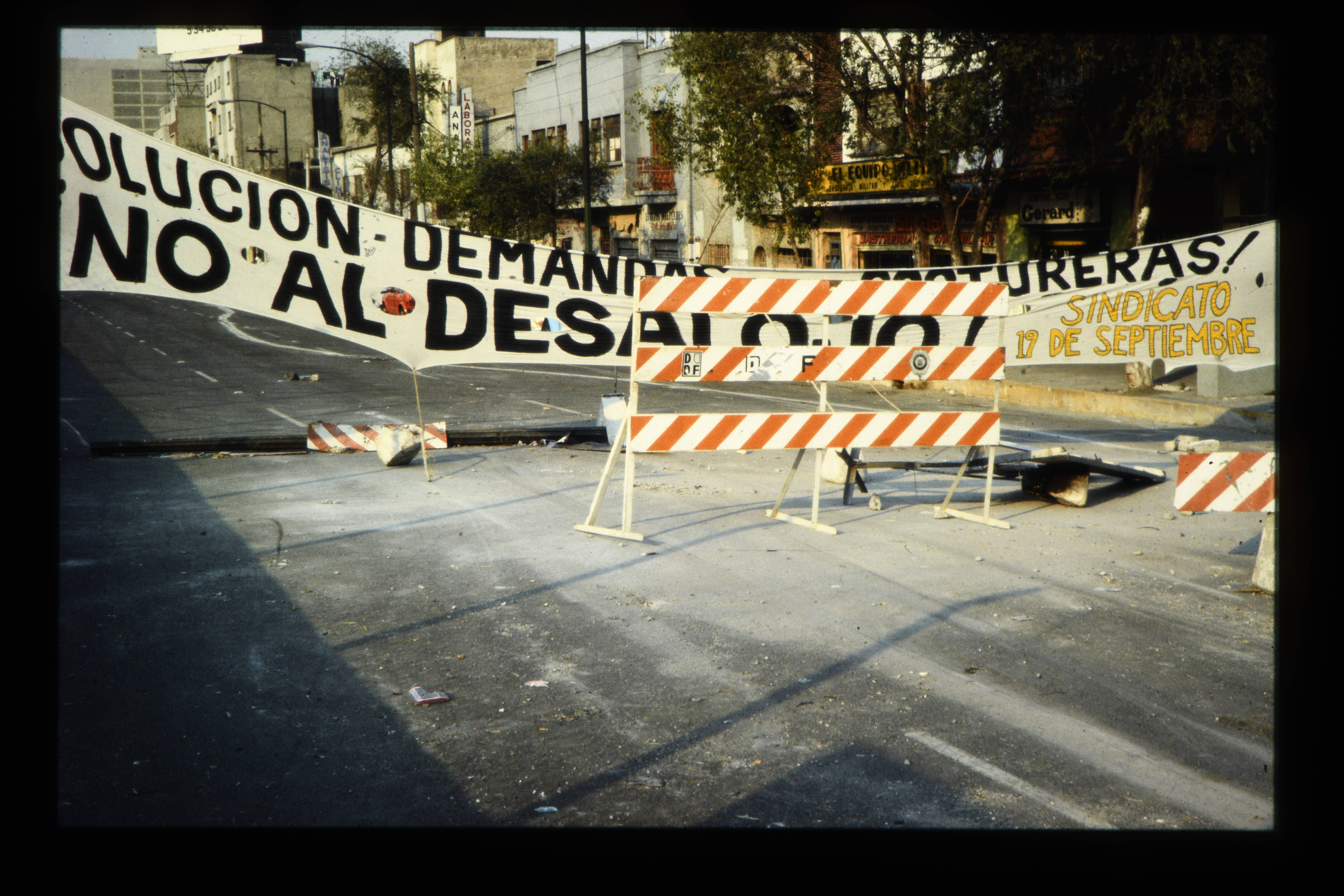 'Straat San Antonio Abad. Naaisters vakbond zetten straaten af ter voorkoming van leeghalen fabriekjes, die gedeeltelijk verwoest zijn door aardbeving. Veel naaisters zijn omgekomen tijdens aardbeving.'