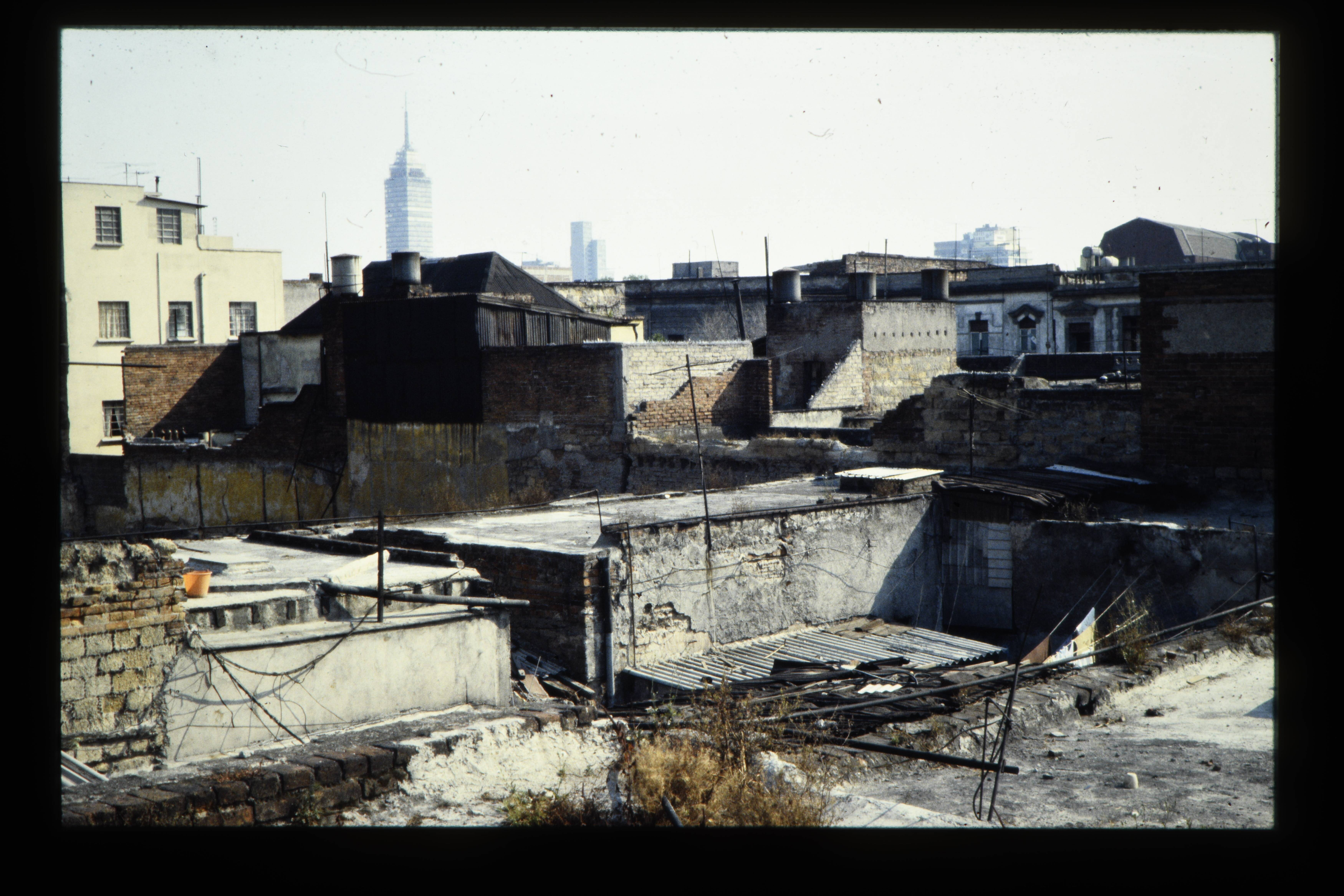 'Huizen uit de volkswijk, kantoor van de volkswijkorganisatie in ingestort huis.'