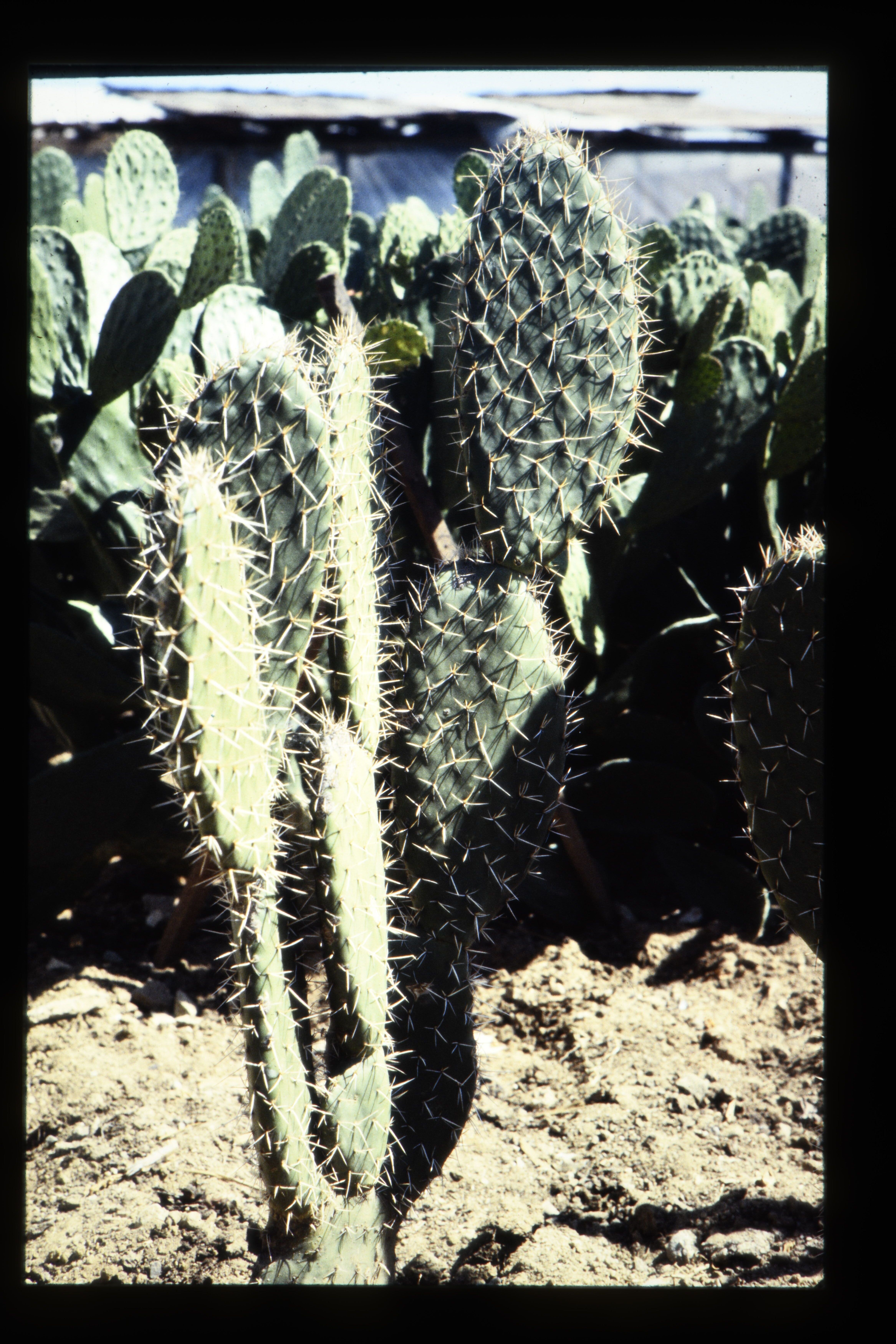 'Experimentele kwekerij van Cochinilla(?) in de buurt van Oaxaca. Rode kleurstof voor verfstof Cactus heet Nopal. insect op cactus geeft de verfstof.'