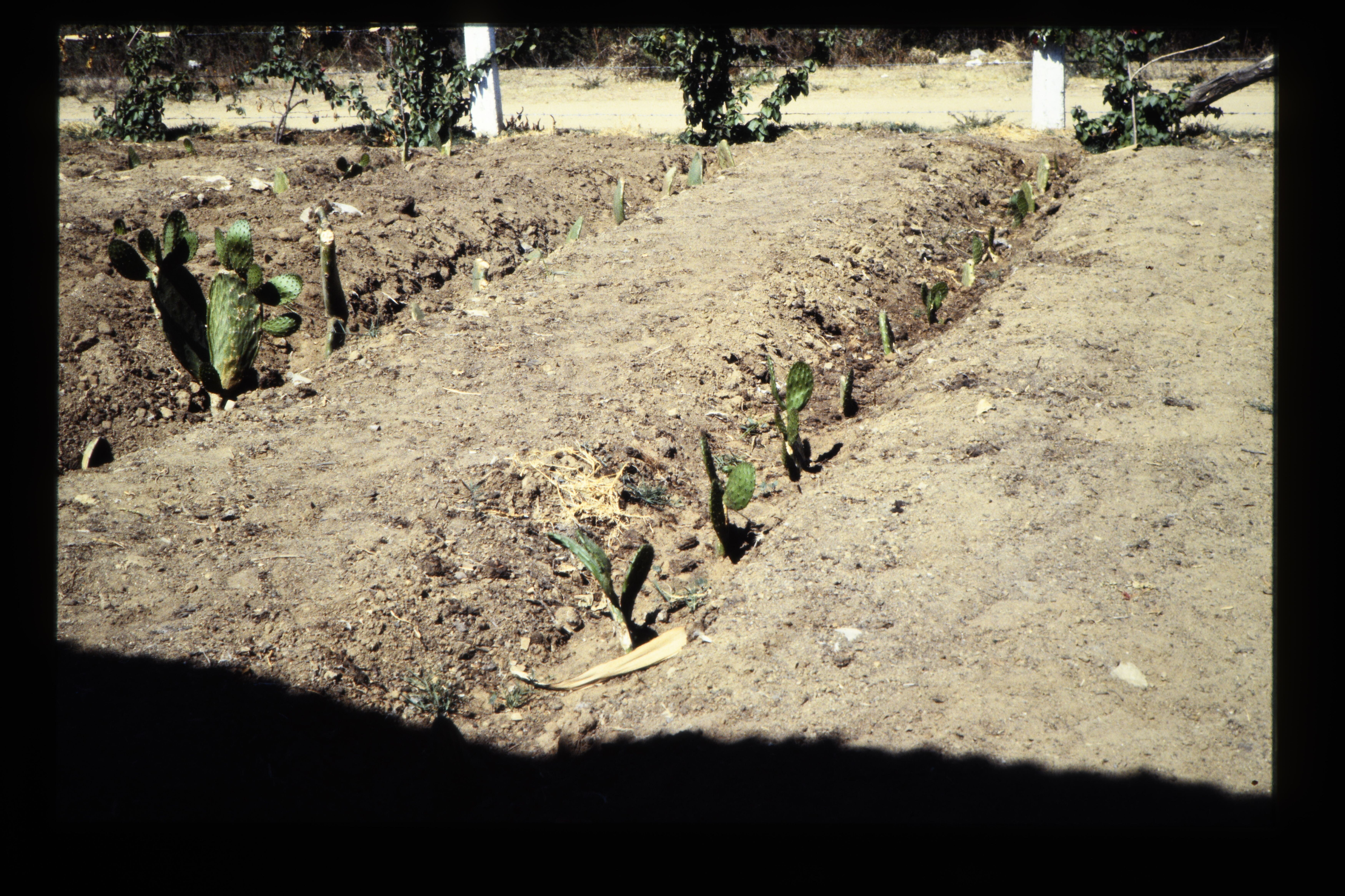 'Experimentele kwekerij van Cochinilla(?) in de buurt van Oaxaca. Rode kleurstof voor verfstof Cactus heet Nopal. insect op cactus geeft de verfstof.'