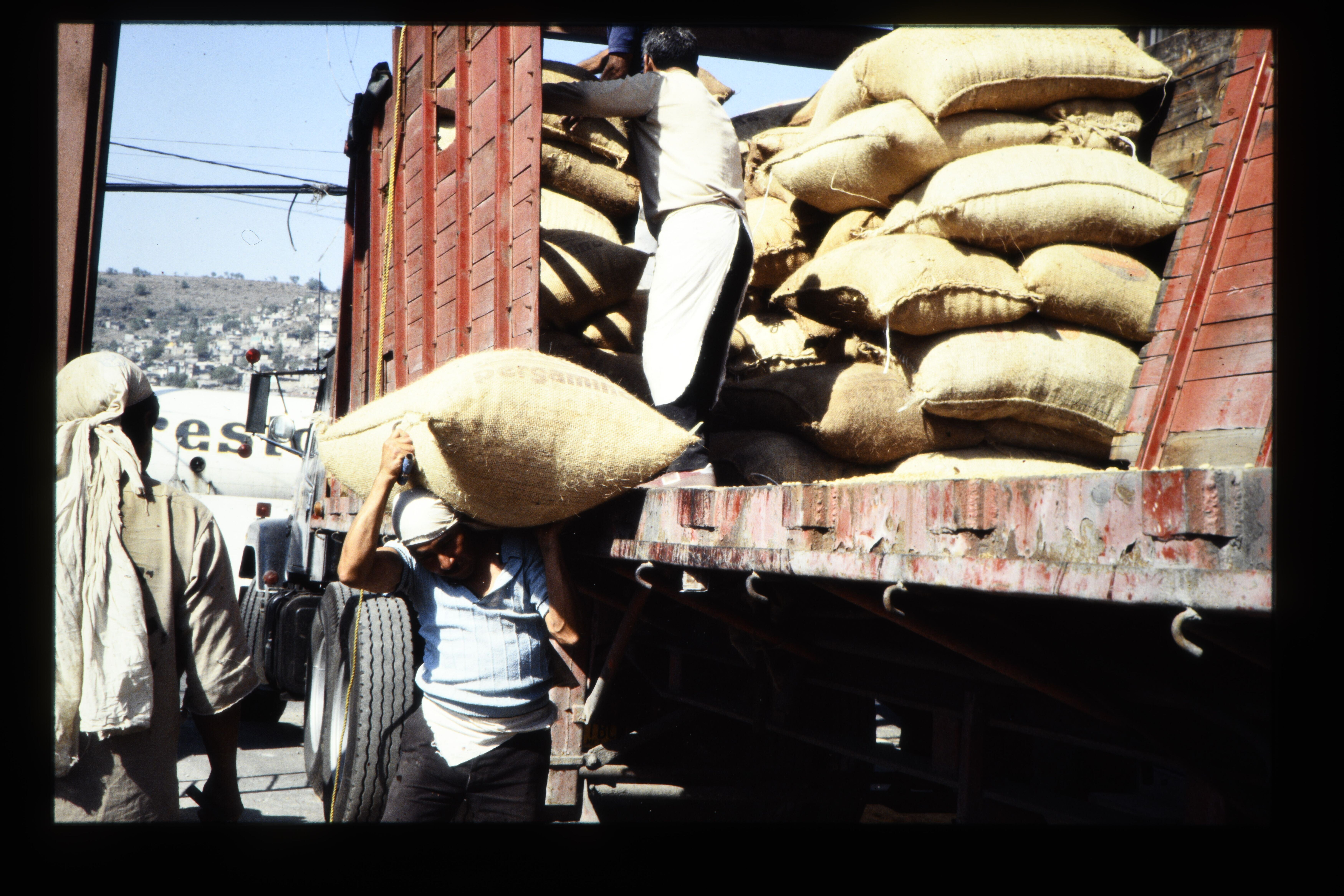 'Koffiefabriek. Verwerking van de koffie branderij, transport, selectie, inpakken in zakken, export naar o.a. Europa. Veel handarbeid o.a. tilwerk wordt door mensen gedaan die de bijnaam burros (werkezels) hebben. San Juan Ixhuatepec.'
