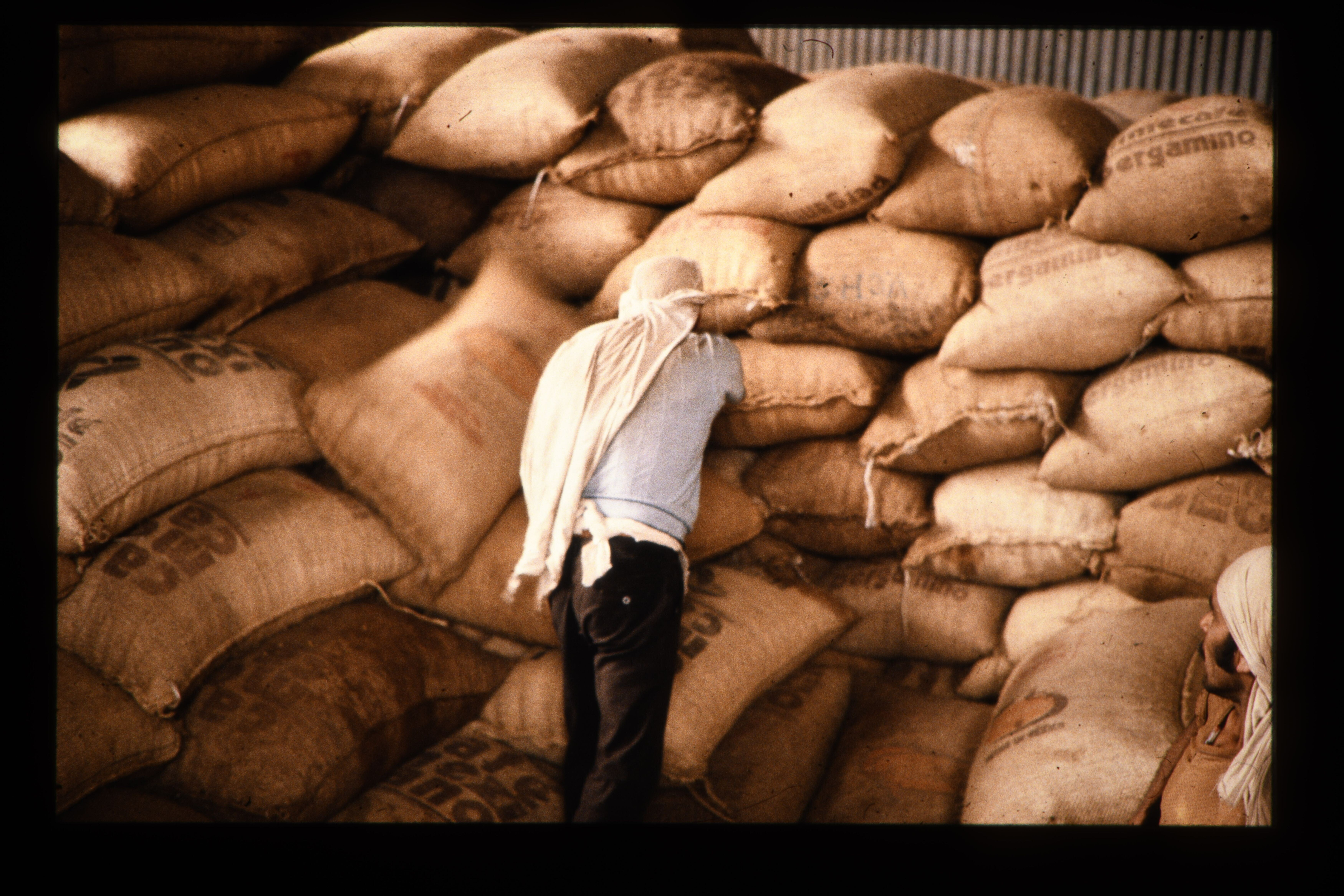 'Koffiefabriek. Verwerking van de koffie branderij, transport, selectie, inpakken in zakken, export naar o.a. Europa. Veel handarbeid o.a. tilwerk wordt door mensen gedaan die de bijnaam burros (werkezels) hebben. San Juan Ixhuatepec.'