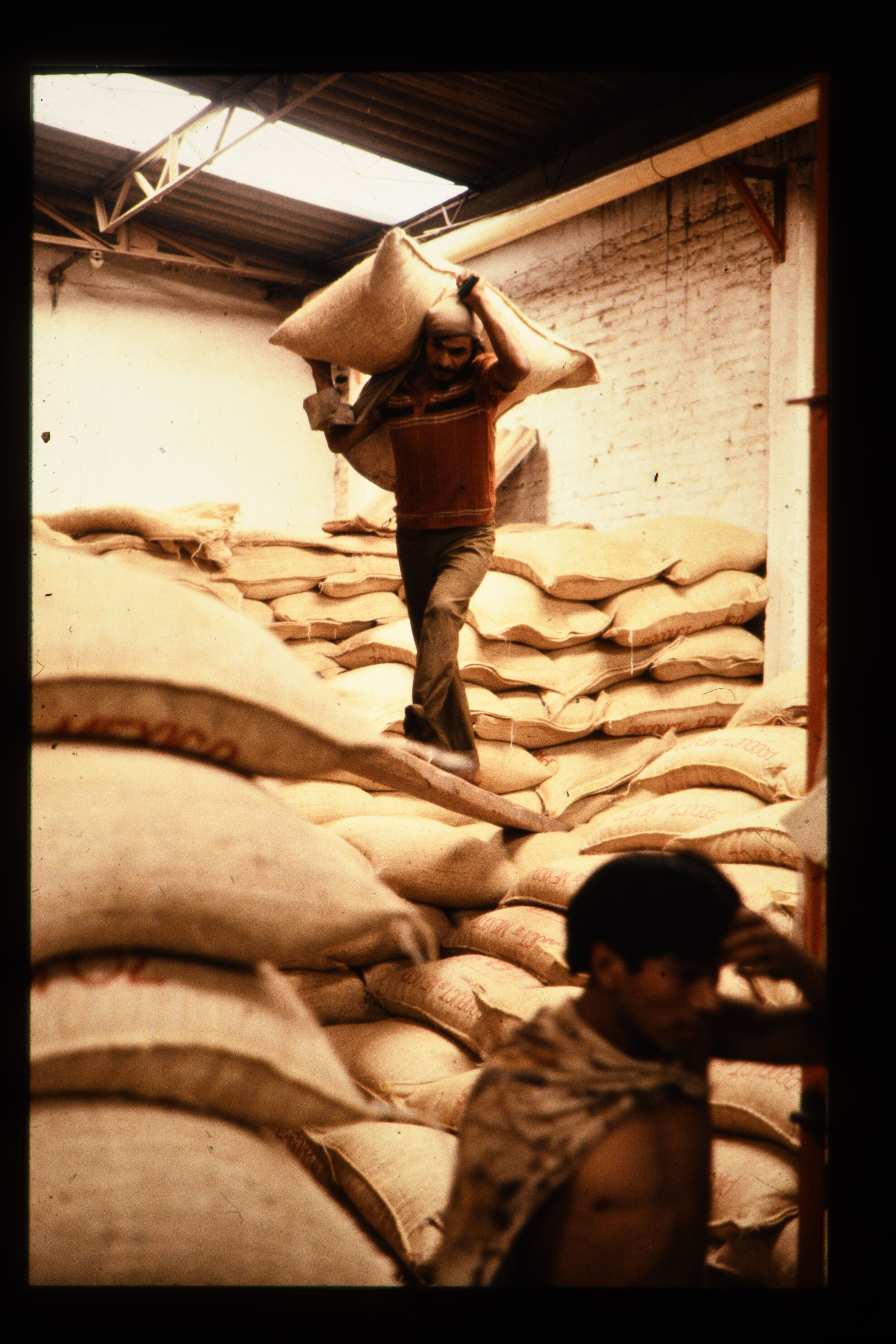 'Koffiefabriek. Verwerking van de koffie branderij, transport, selectie, inpakken in zakken, export naar o.a. Europa. Veel handarbeid o.a. tilwerk wordt door mensen gedaan die de bijnaam burros (werkezels) hebben. San Juan Ixhuatepec.'