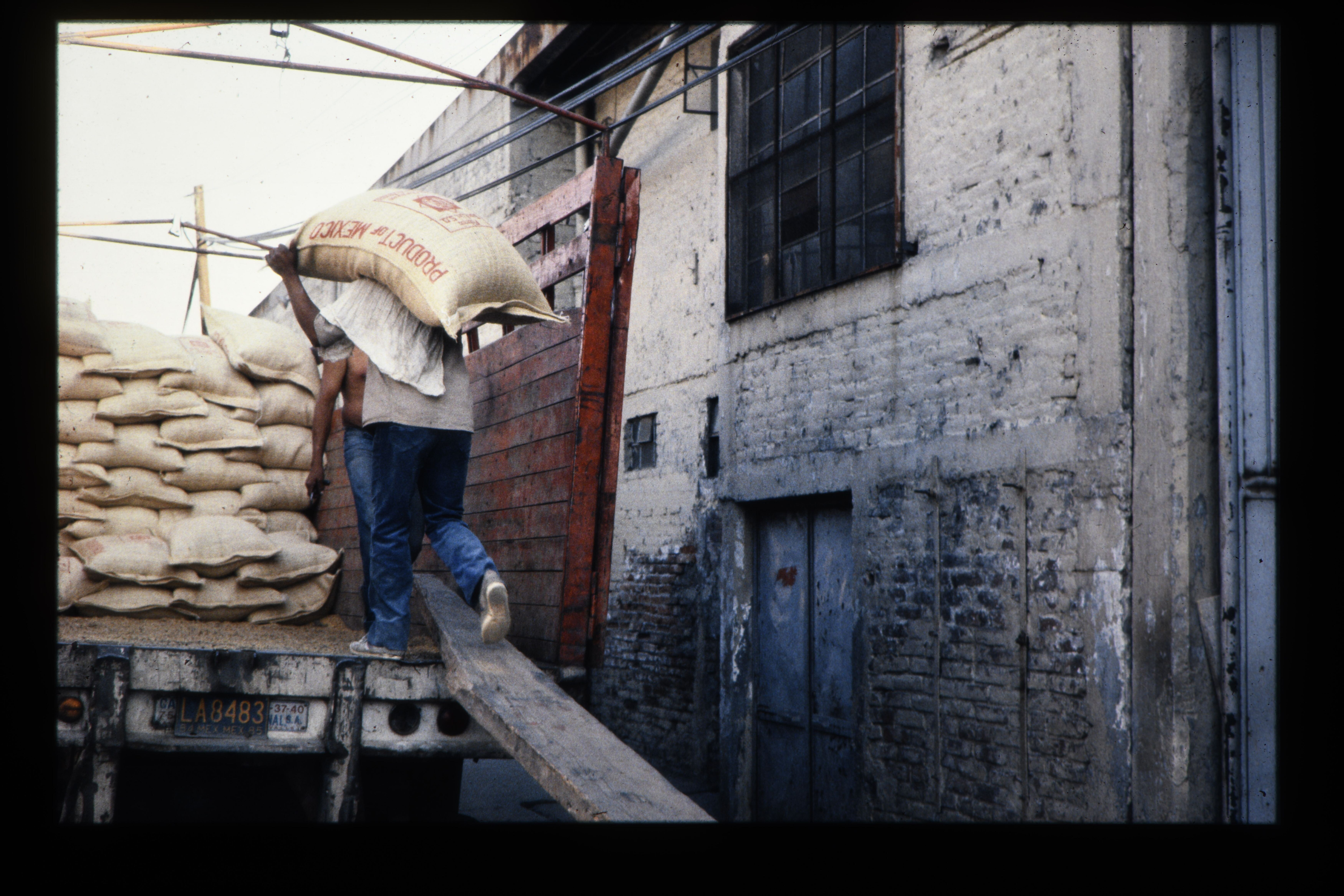 'Koffiefabriek. Verwerking van de koffie branderij, transport, selectie, inpakken in zakken, export naar o.a. Europa. Veel handarbeid o.a. tilwerk wordt door mensen gedaan die de bijnaam burros (werkezels) hebben. San Juan Ixhuatepec.'