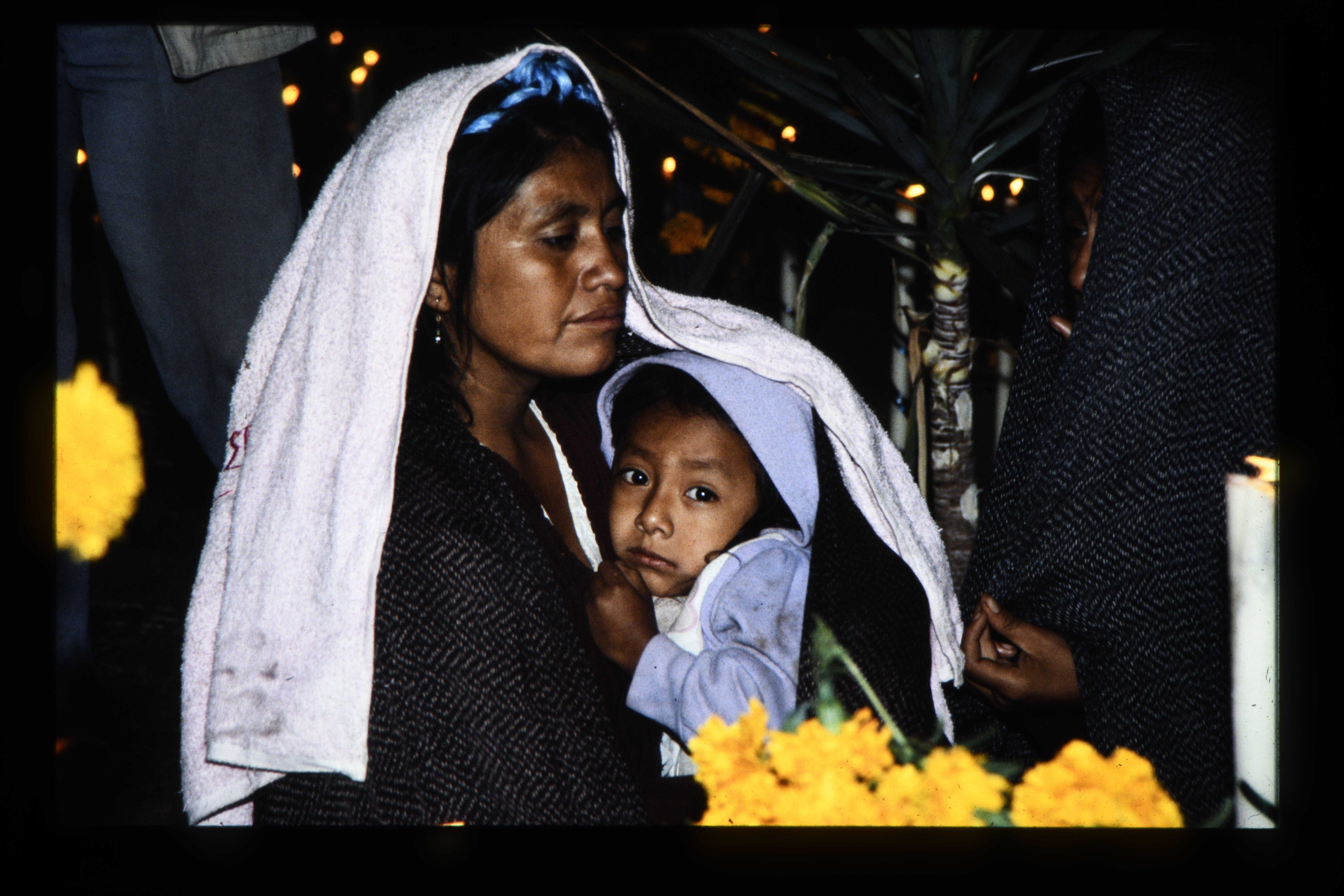 'Bij de viering van Allerzielen worden 's nachts op het kerkhof kaarsen gebrand. Santa María Atzompa (provincie Oaxaca). '