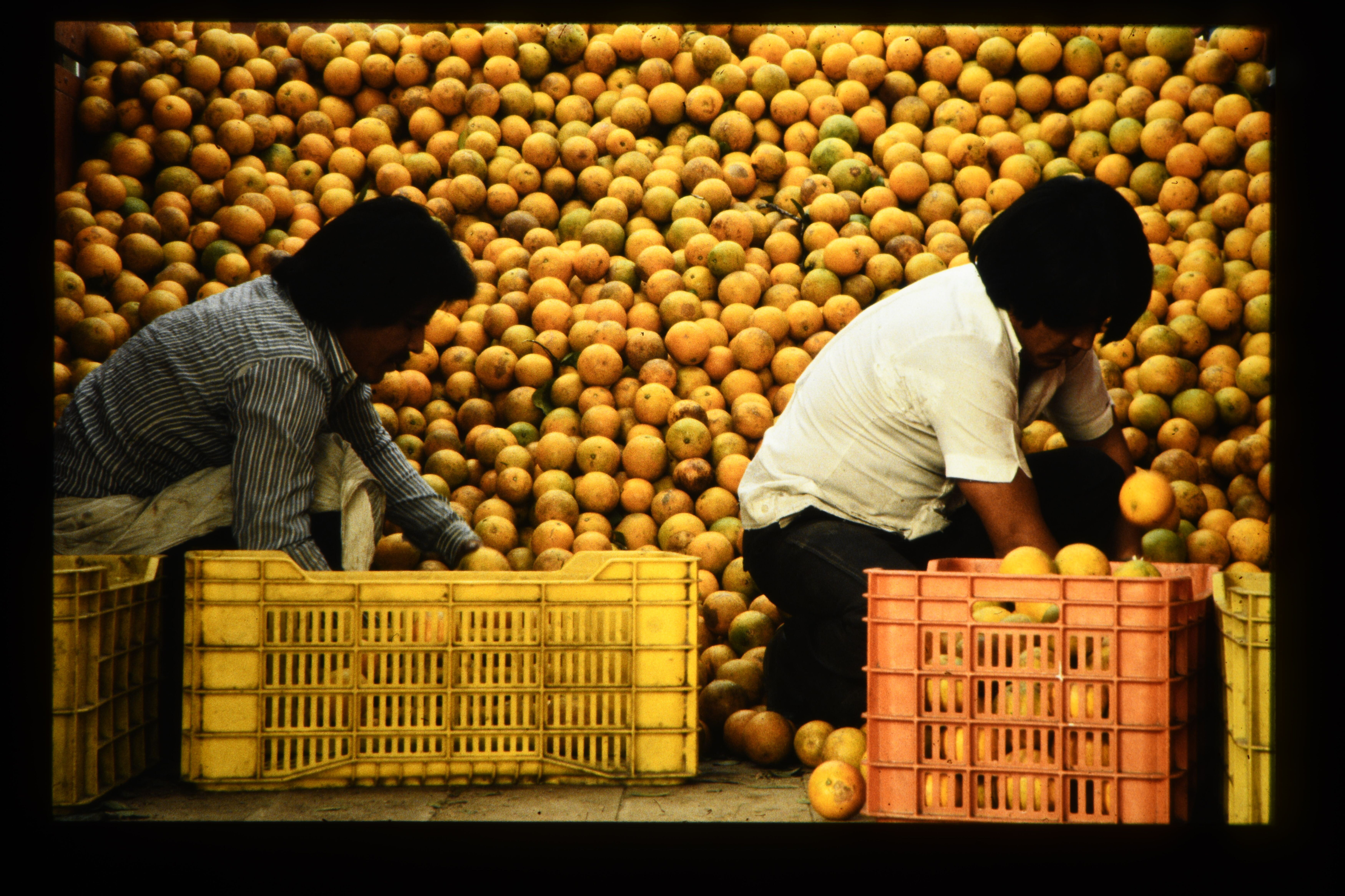 'In kisten doen van citrusvruchten. Markthallen. Mexico-Stad. '