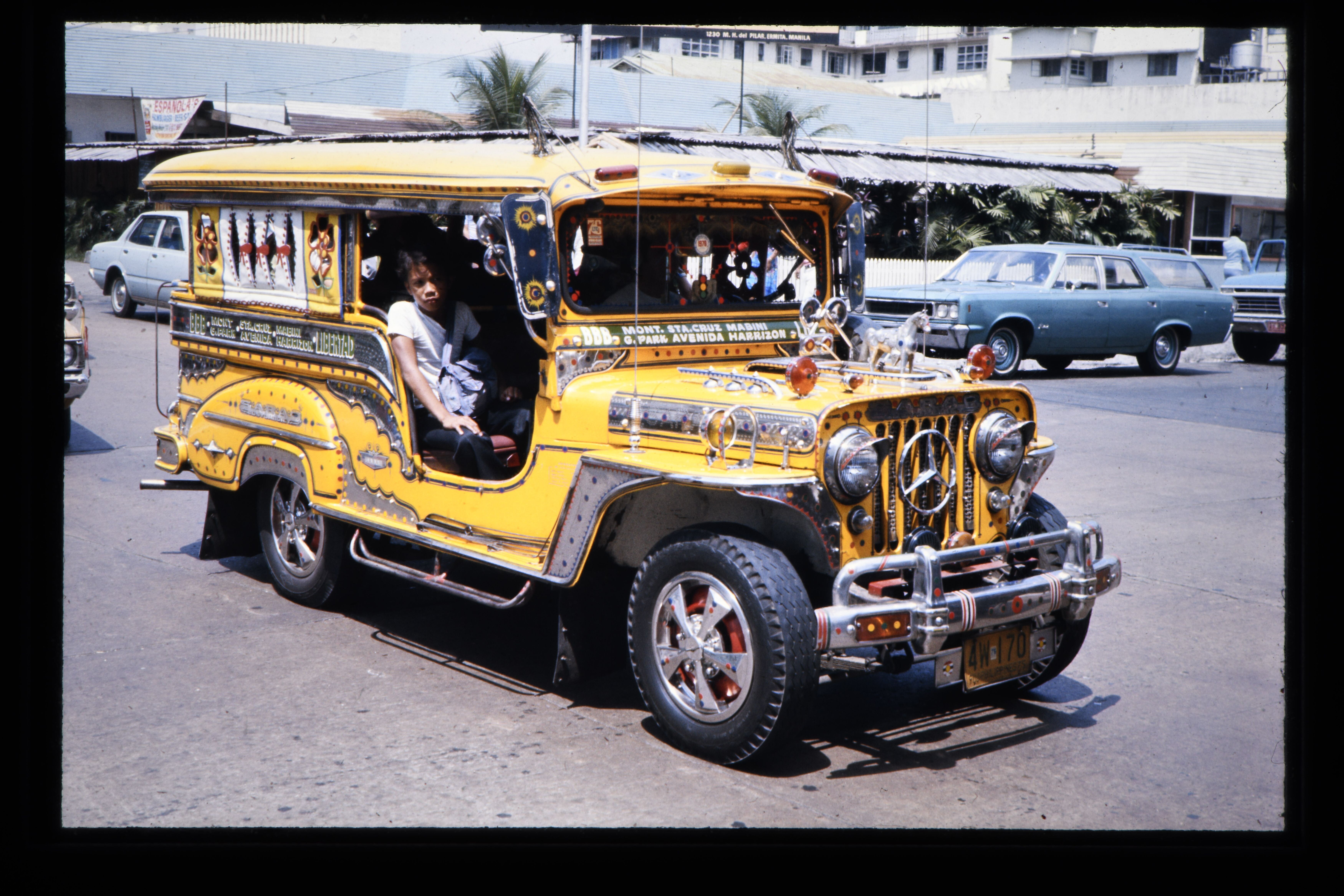 'Jeepney's vaak schitterend versierd, voor een klein bedrag kan men hele afstanden rijden, met hand opsteken kan men zo een vehikel aanhouden, als automobilist in Manilla moet je uitkijken want de Jeepney's stoppen lukraak in het verkeer om klanten op te p'