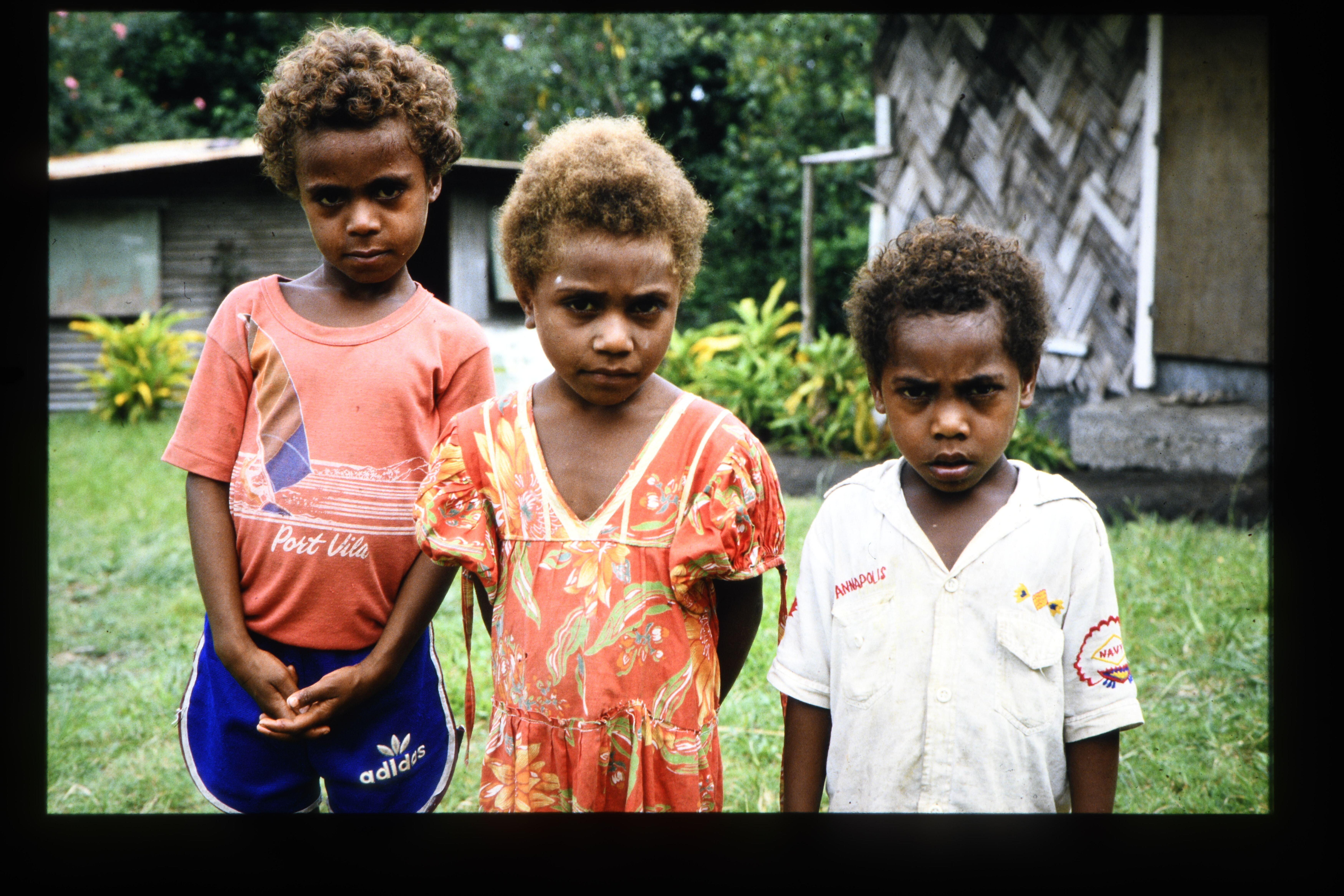 'Poserende kinderen bij hun lagere school Eiland Tanna'