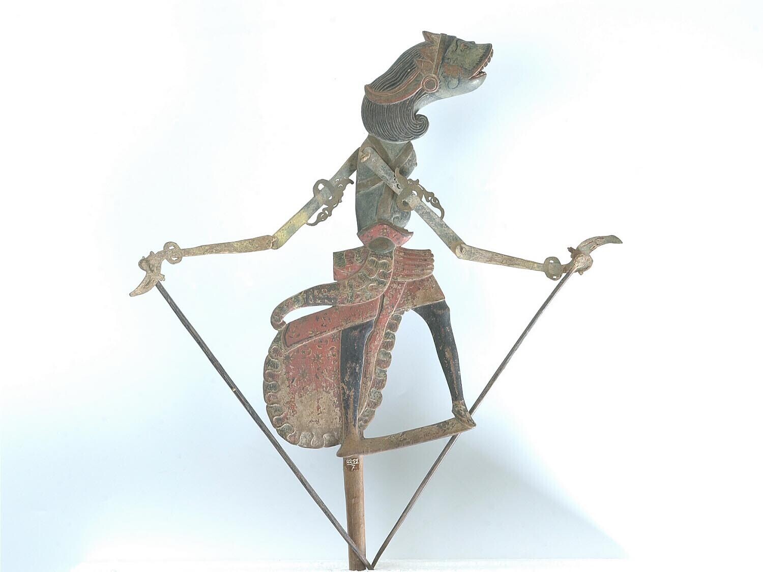 Wajangpop, demonenfiguur met wijd openstaande bek en grote tanden
