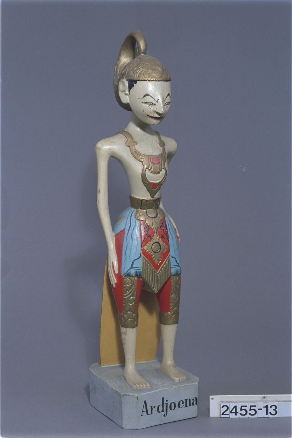 Beschilderd houten beeld op voetstuk voorstellende Arjuna