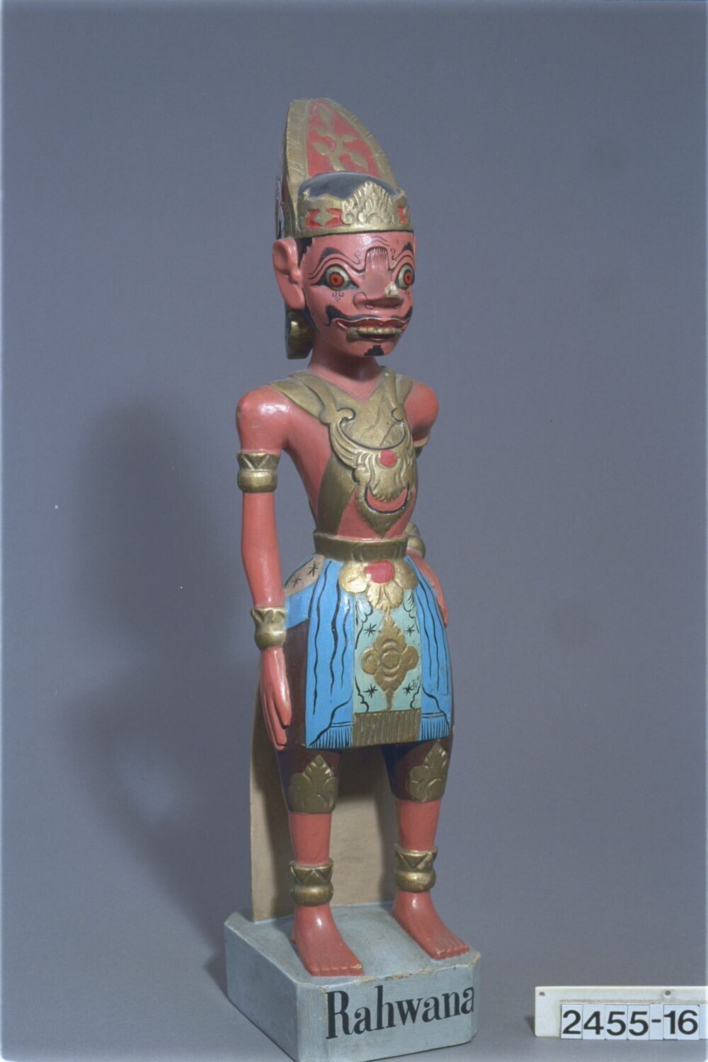 Beschilderd houten beeld op voetstuk voorstellende Rahwana