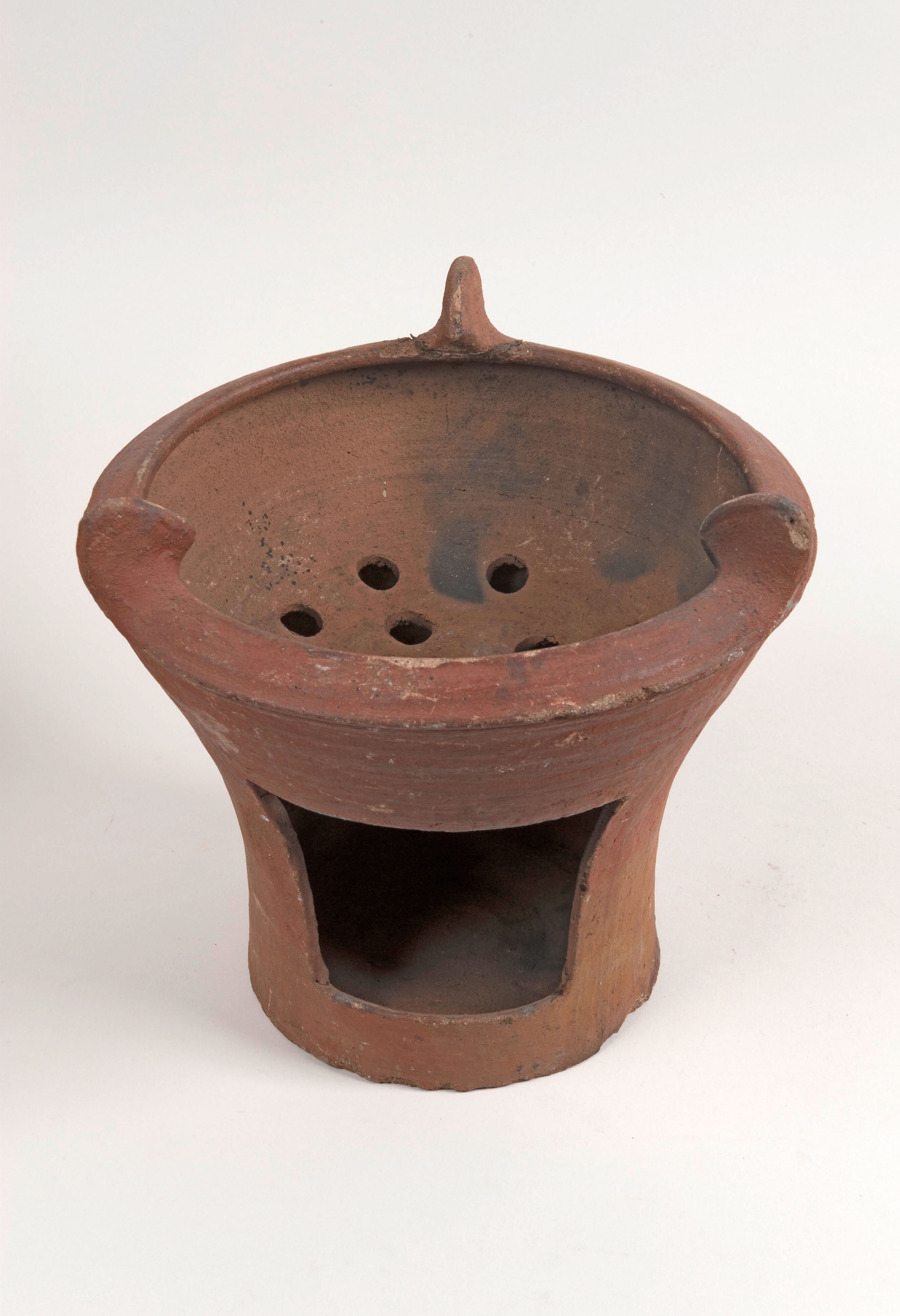 Aardewerken komfoor gebruikt bij het batikken en een plastic zakje met houtskool
