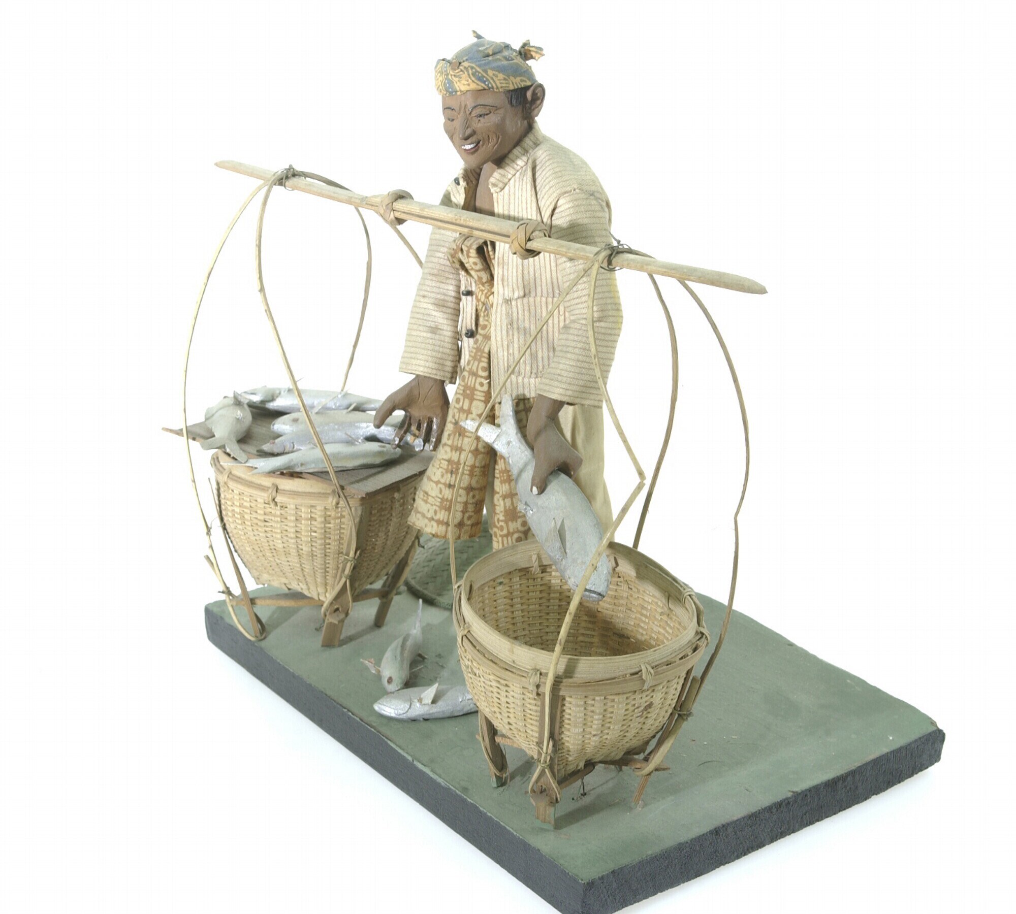 Model van een visverkoper met juk attributen