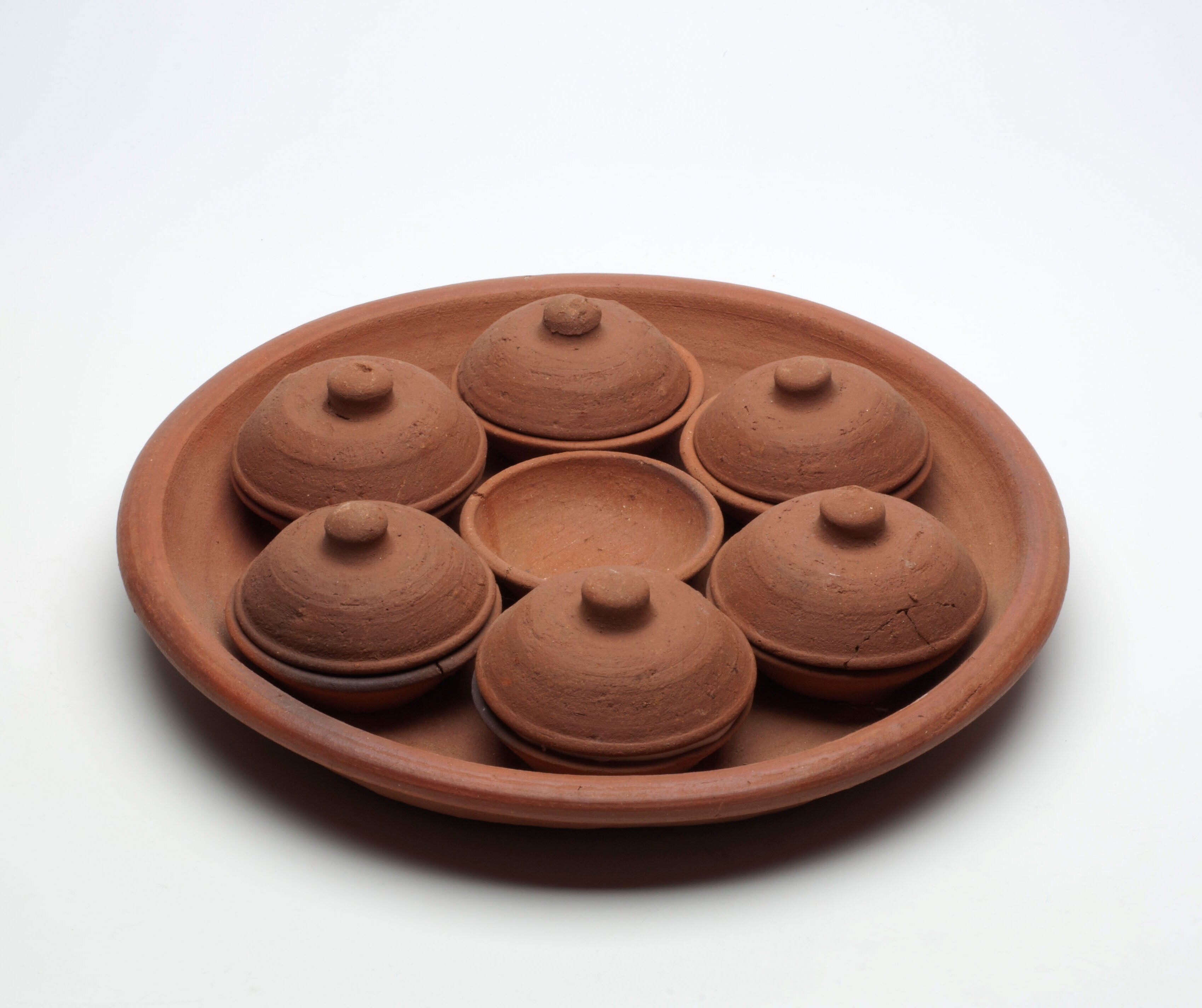 Aardewerken koekjesschaal met zeven kleine schaaltjes en bijbehorende dekseltjes