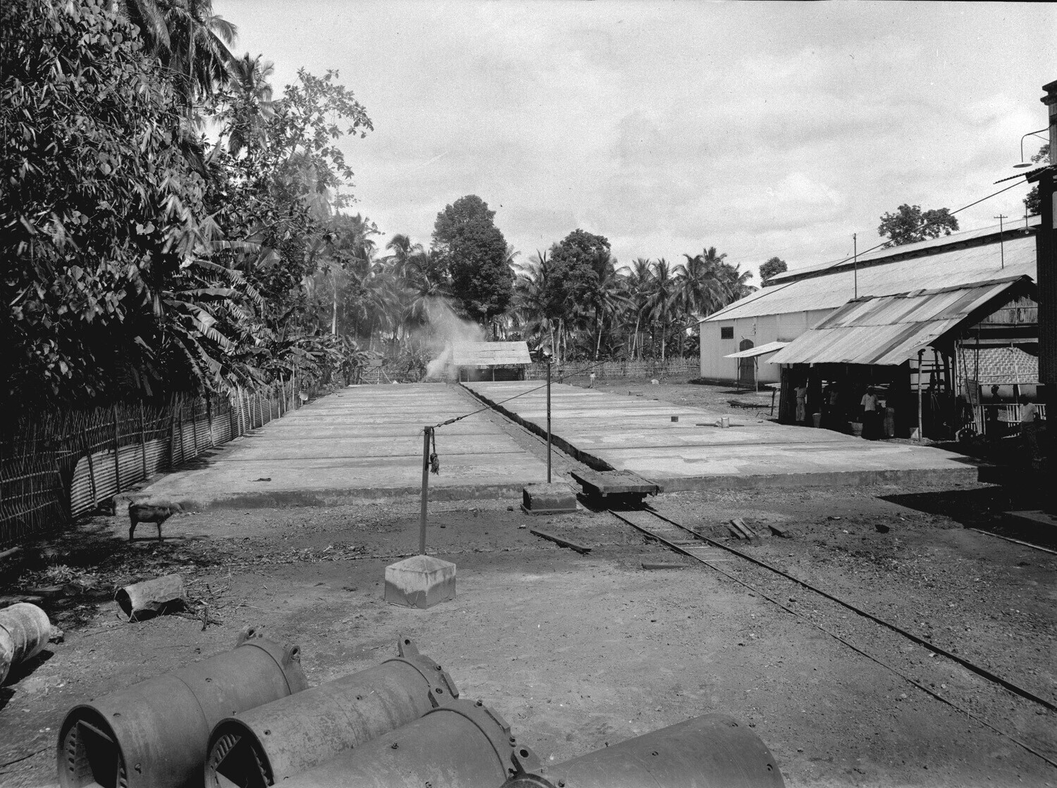 Droogvloeren aan de rand van het fabrieksterrein van Mexolie in Tjilatjap, Midden - Java.