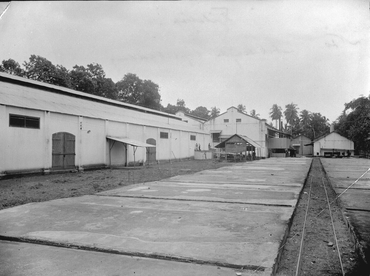 Achterzijde van de kopra-opslag van de Mexoliefabriek te Tjilatjap, Midden-Java.