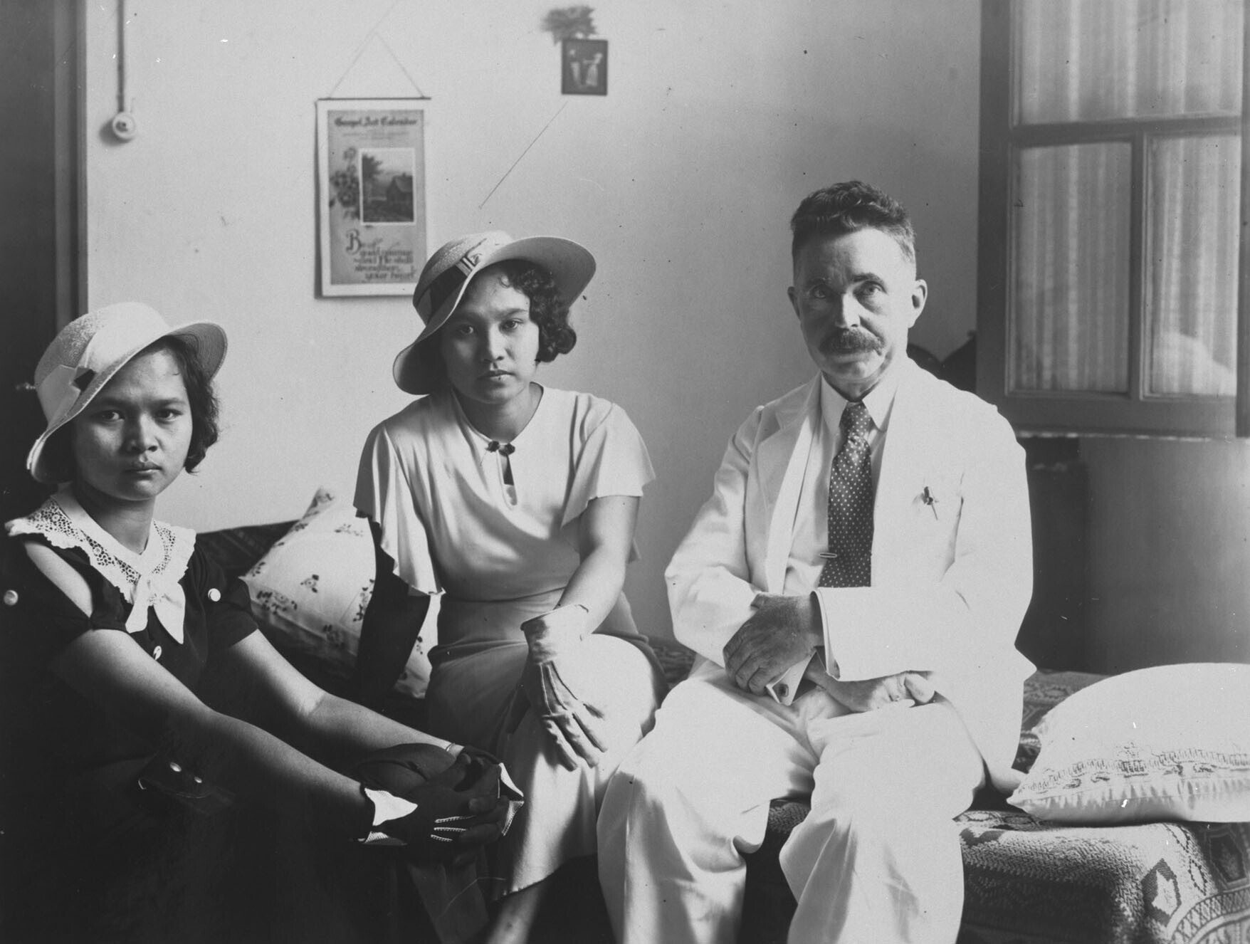 Man in het gezelschap van twee Indo-Europese vrouwen