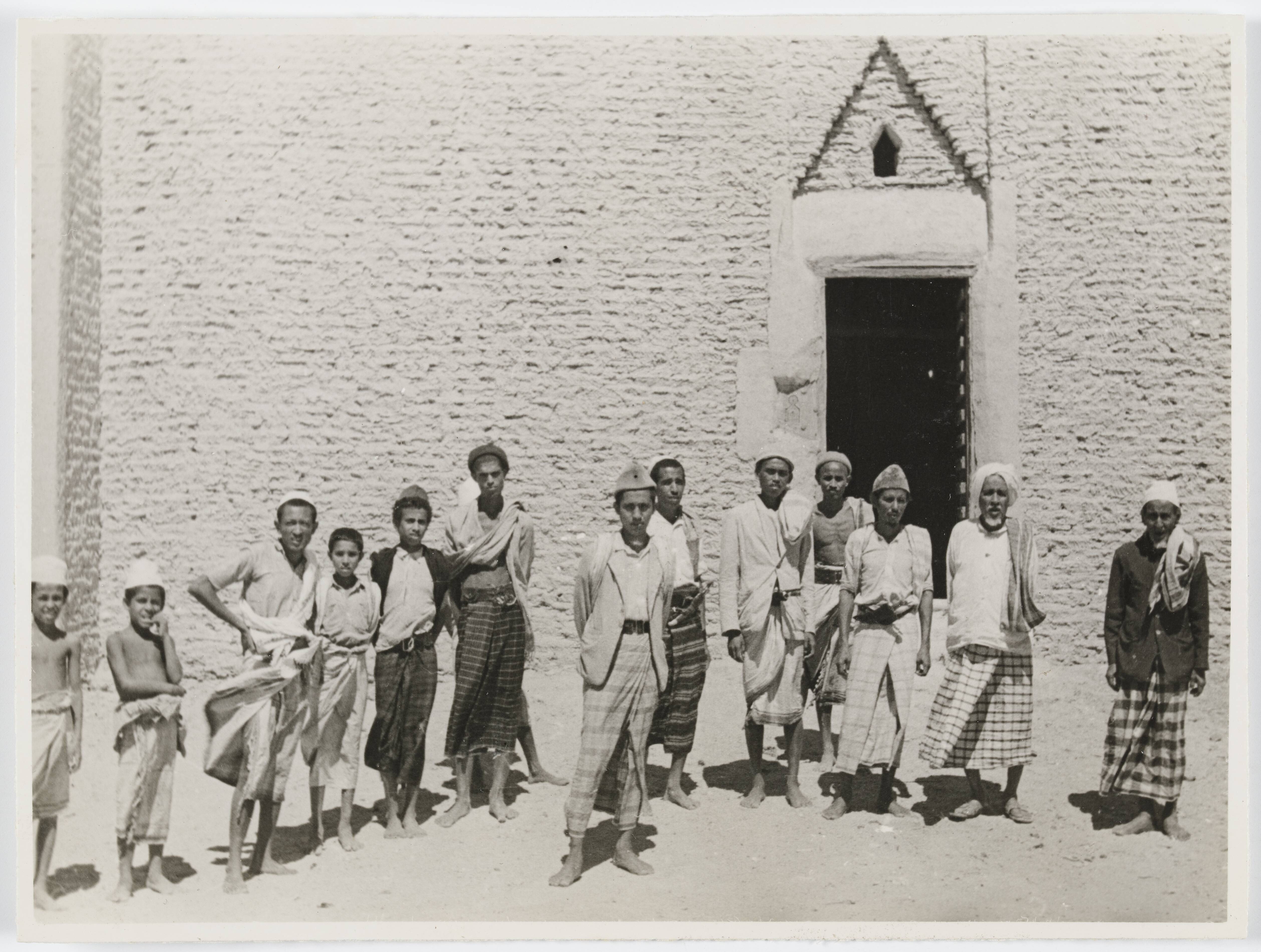 Portret van een groep Jemenieten die zich na een verblijf in Nederlands-Indië weer in Jemen gevestigd hebben