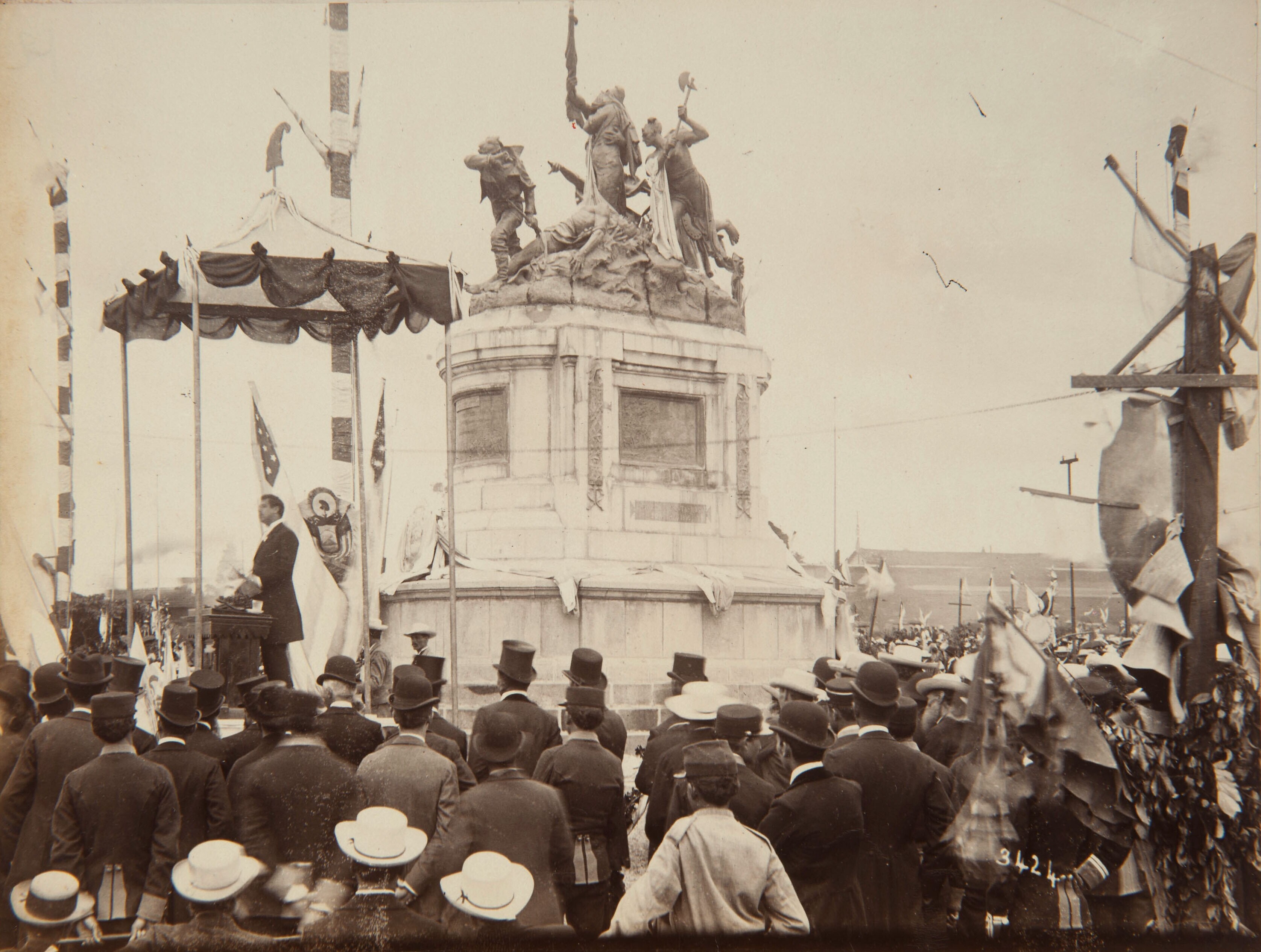 Man houdt een redevoering bij een standbeeld