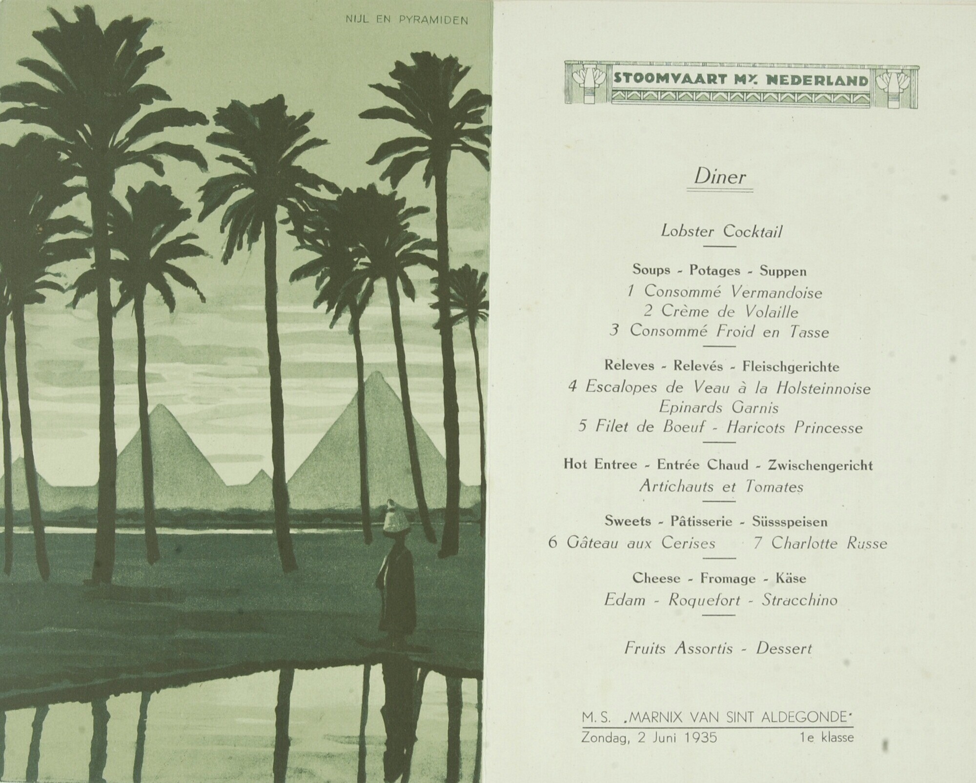 Menukaart van de M.S. 'Marnix van Sint Aldegonde' van Stoomvaart Mij Nederland
