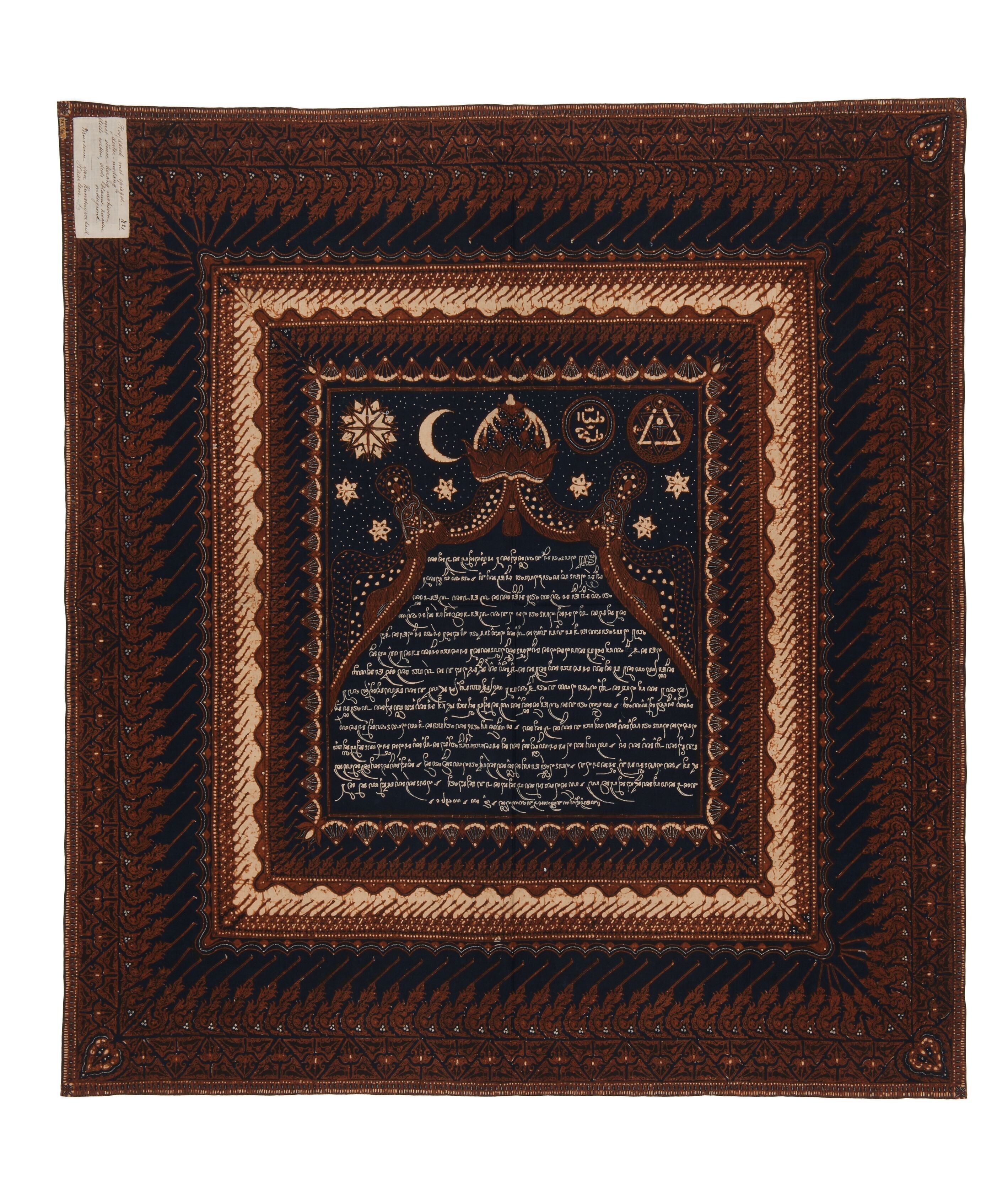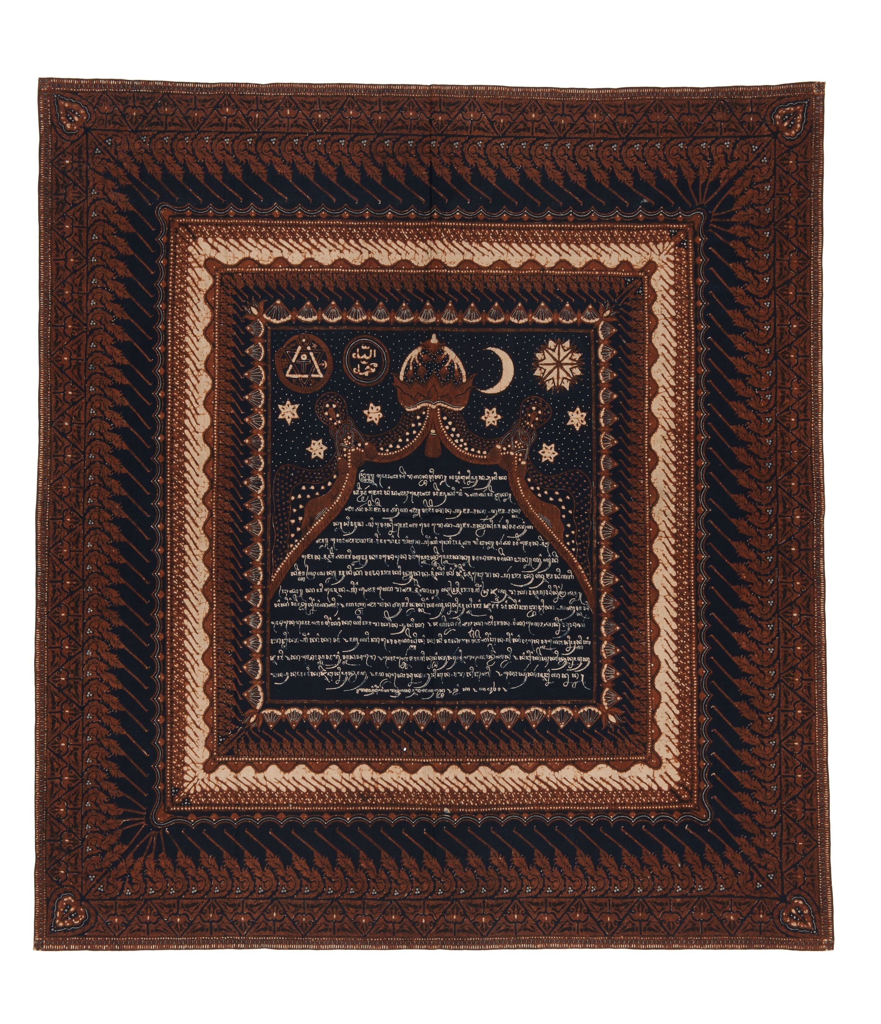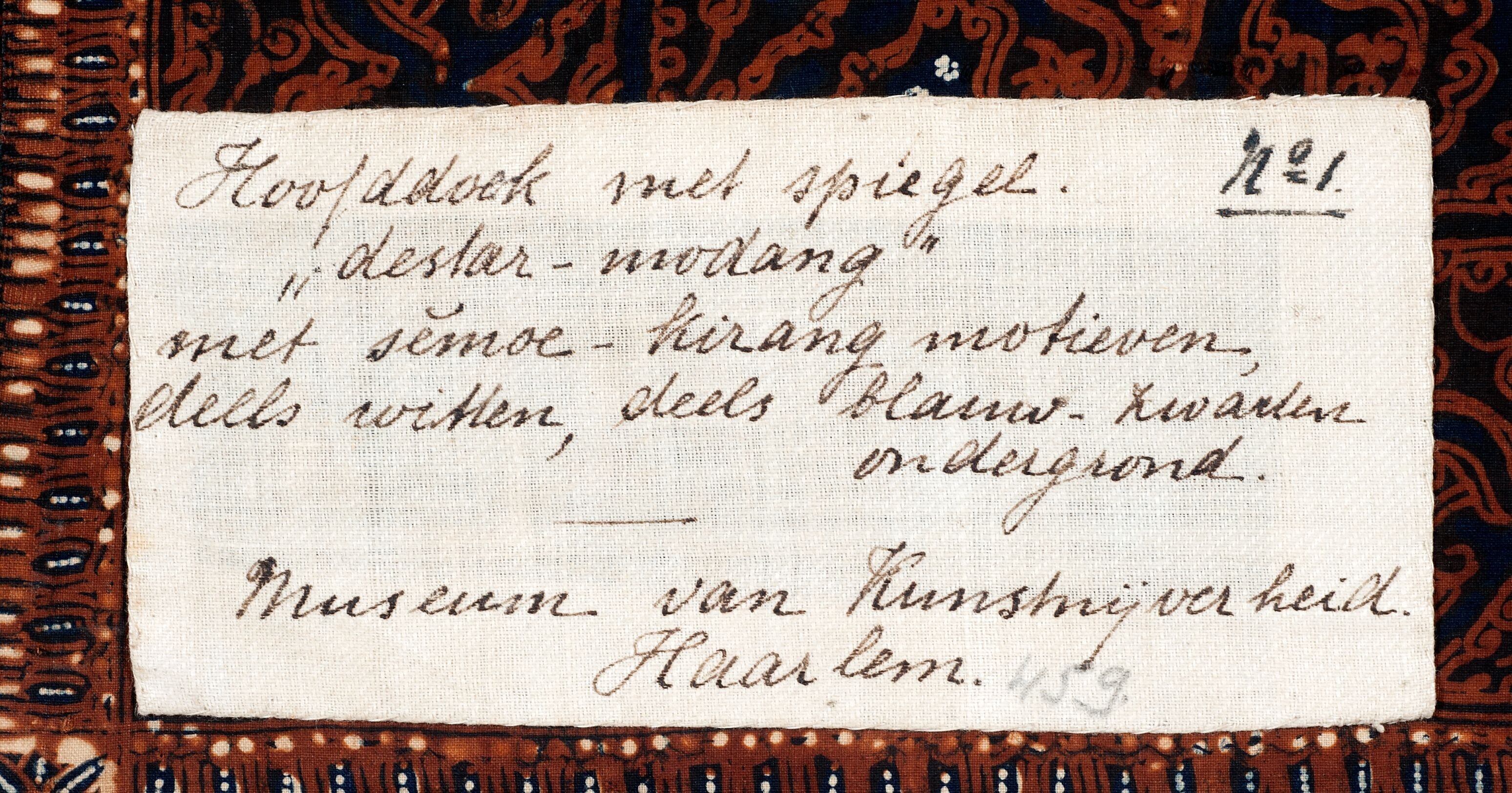 Katoenen hoofddoek voor mannen met tekst in Javaans schrift die handelt over de promotie van de batikkunst