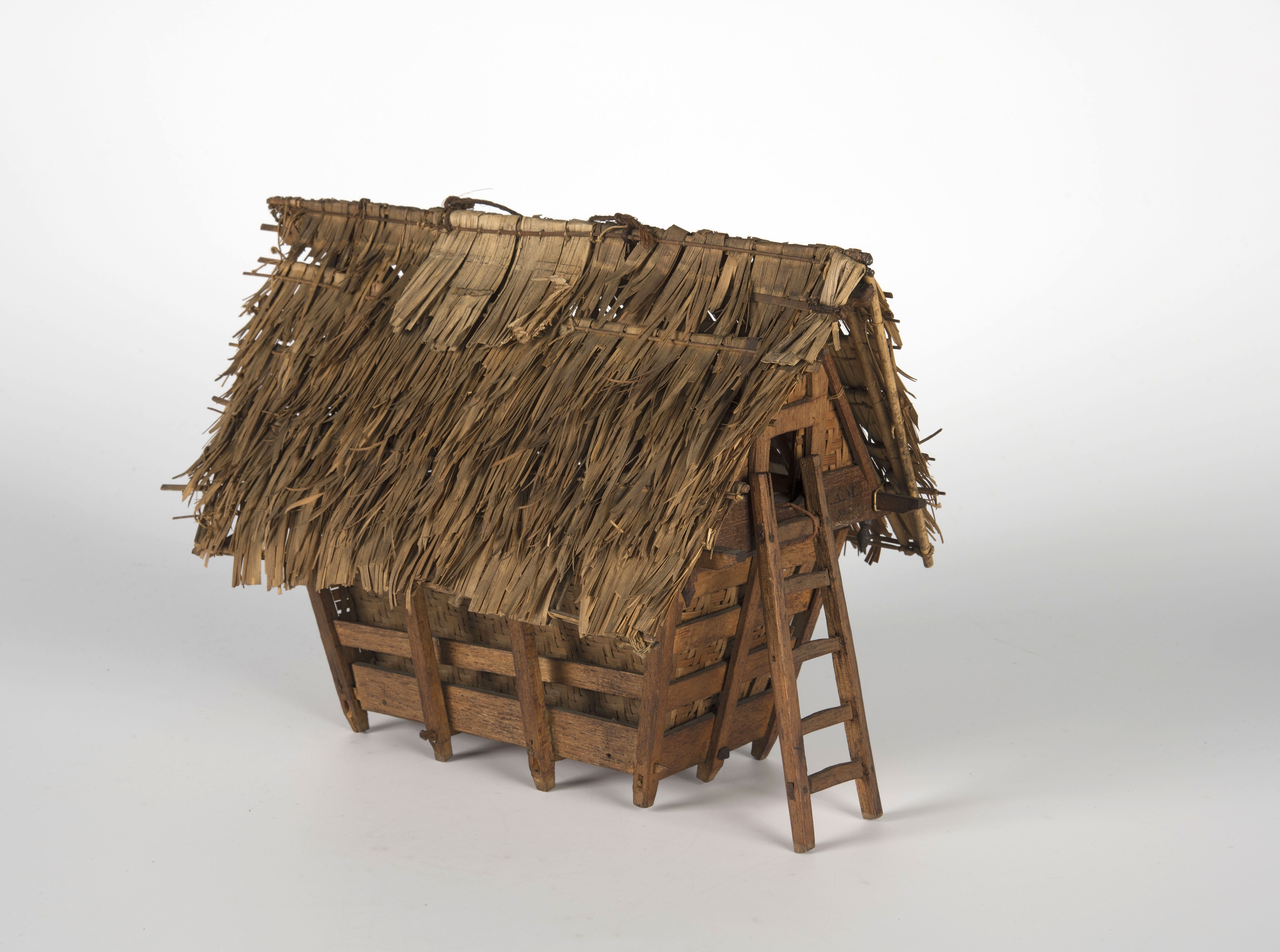 Model van een javaanse rijstschuur vervaardigd uit hout en alang