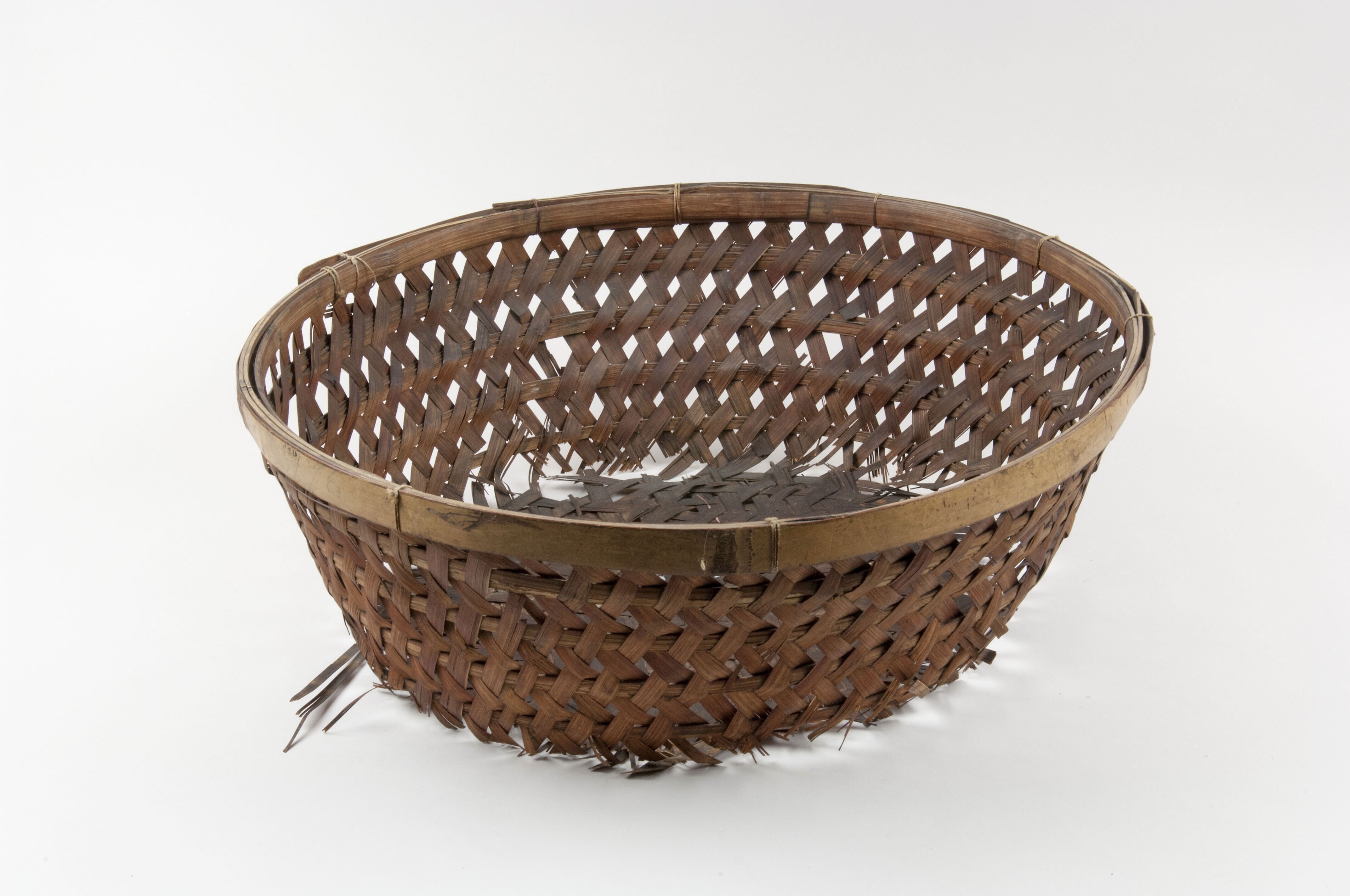 Houten draagjuk met twee gevlochten manden en twee dragers