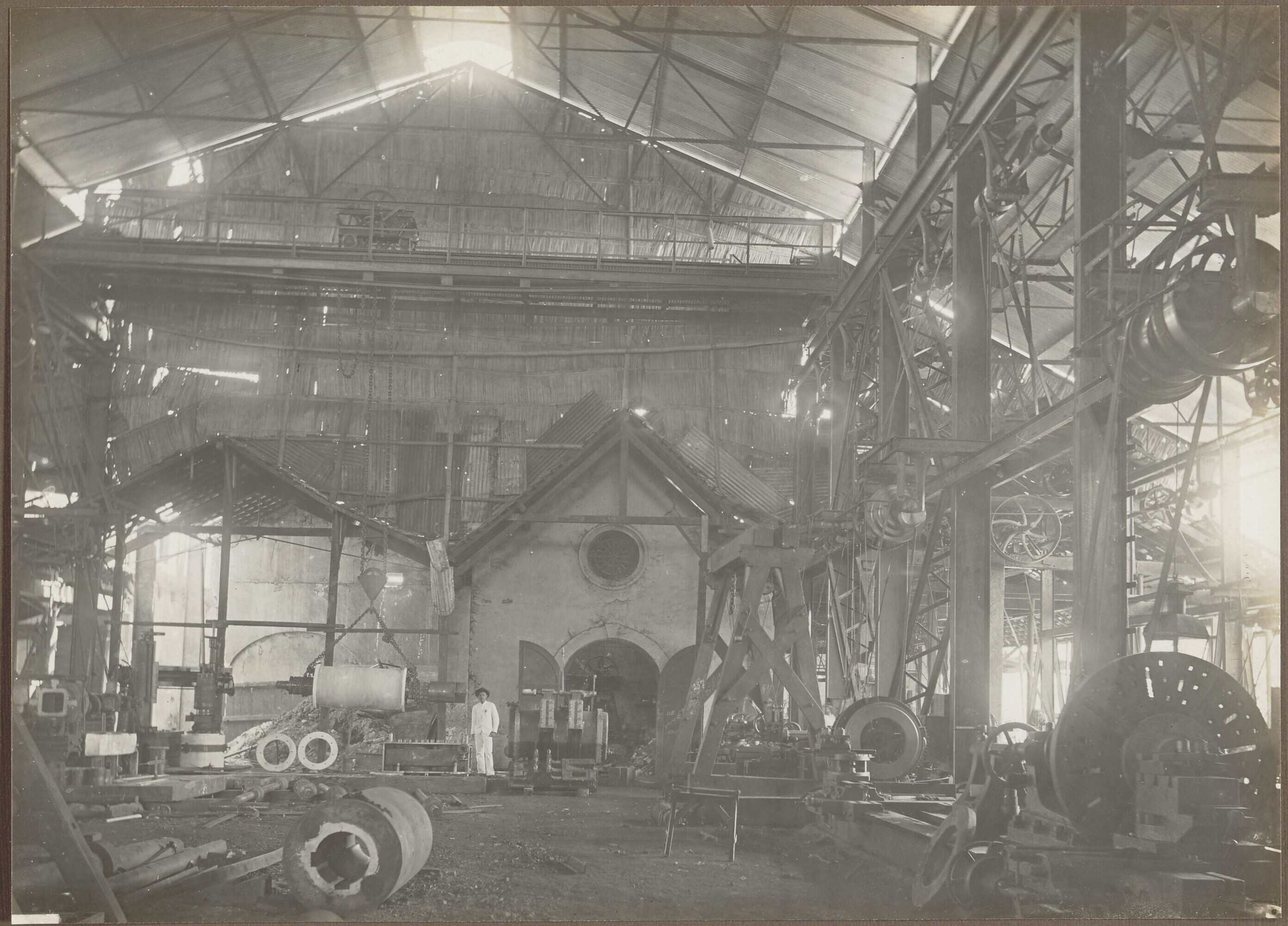 Aanbouw van de nieuwe fabriekshal over de oude hal heen van de N.V. Nederlandsch Indische Industrie te Soerabaja