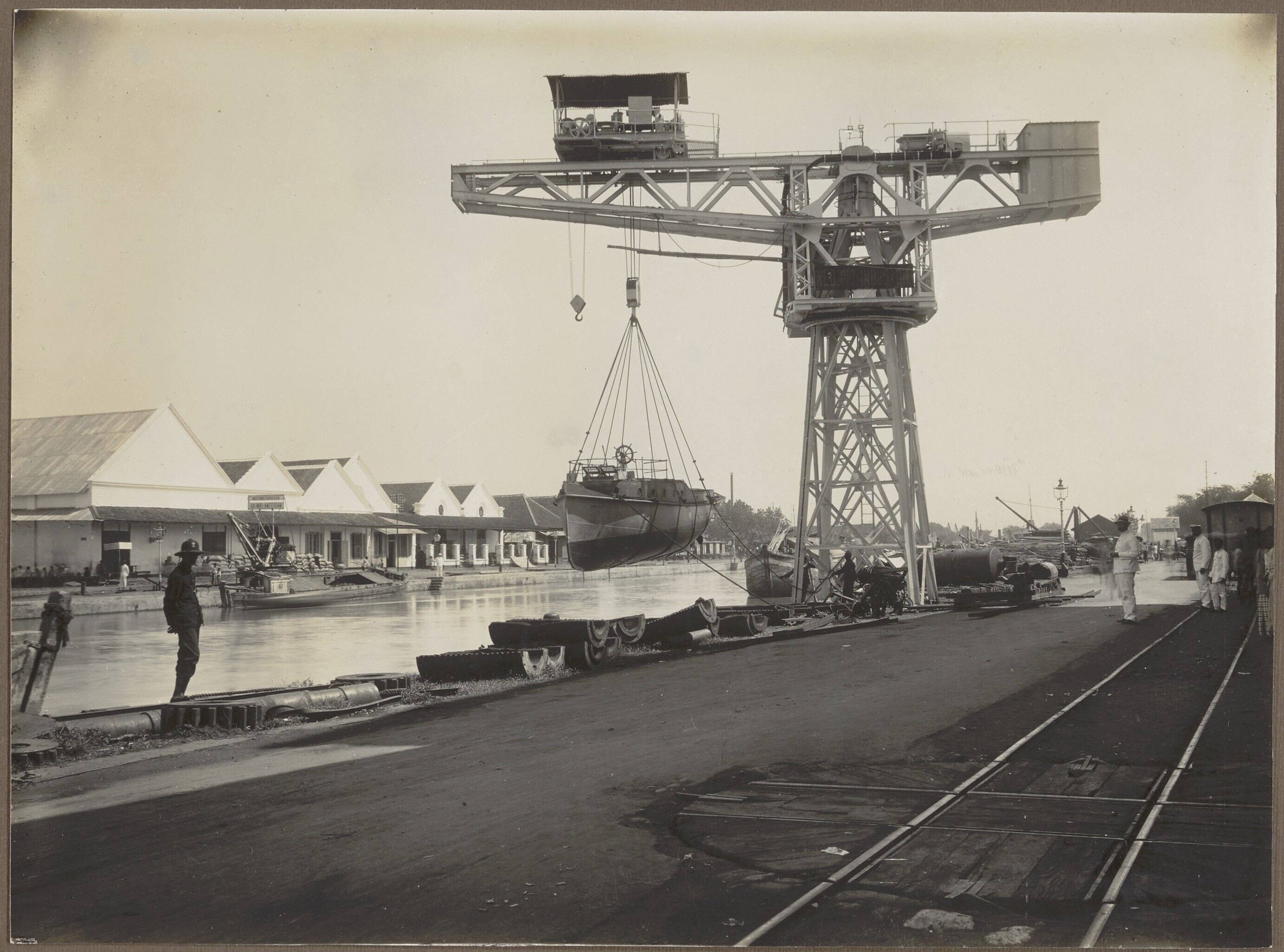 De elektrische 25 tons torenkraan van de fabriek van de Nederlandsch Indische Industrie aan de kade langs de Kalimas rivier te Soerabaja