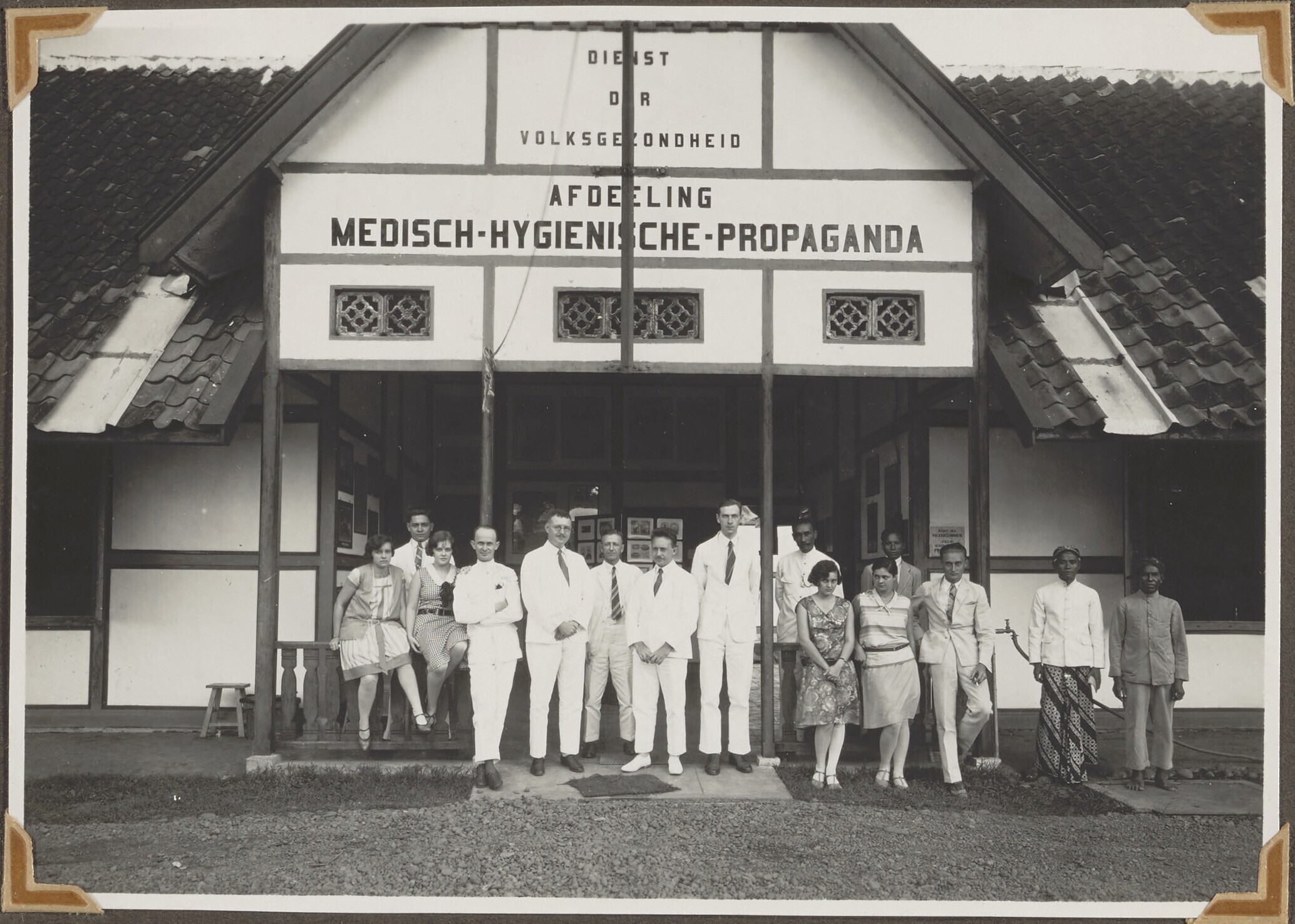 Personeel voor het centraal kantoorgebouw van de afdeling Medisch-Hygiënische Propaganda, Dienst der Volksgezondheid.