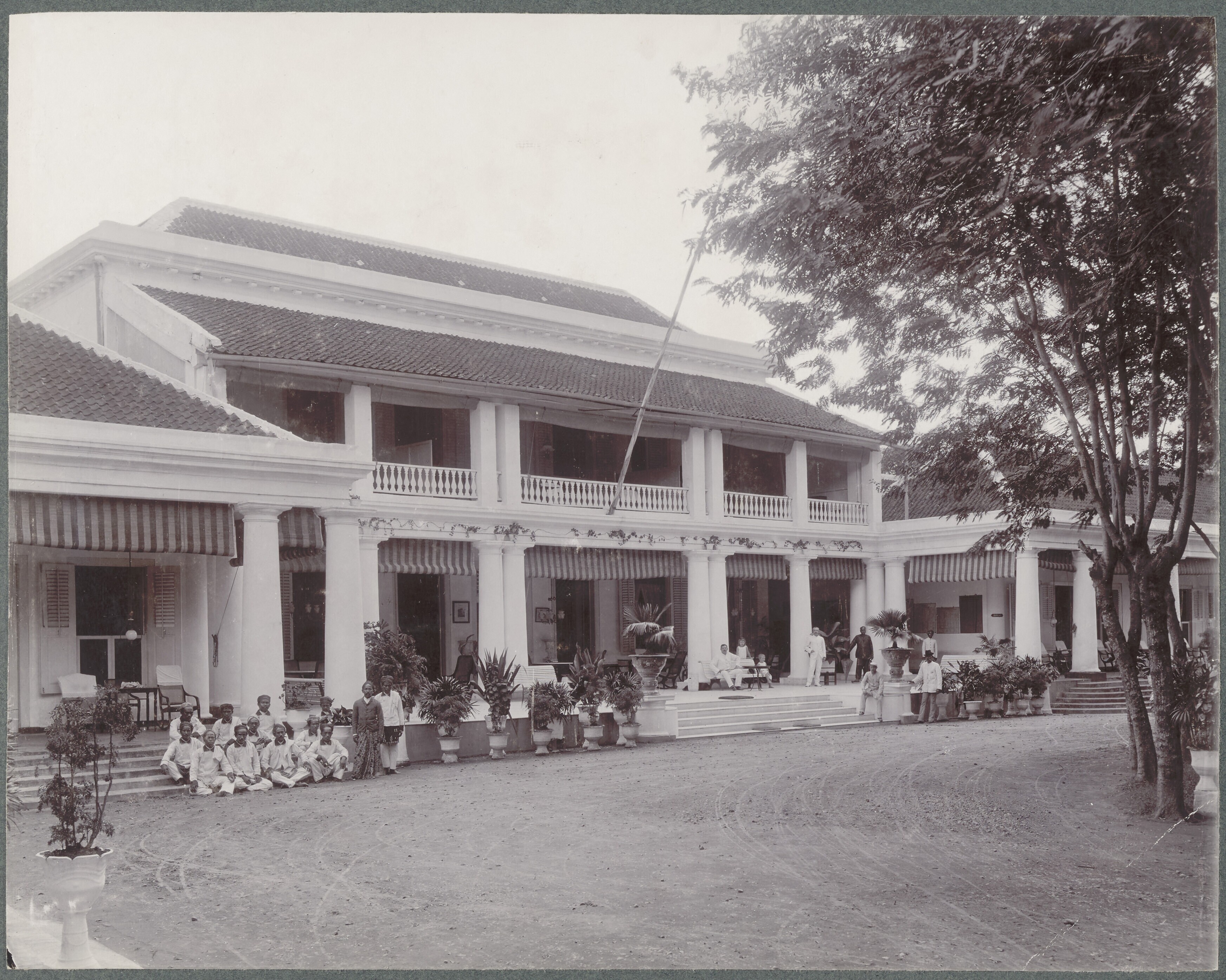 Directeur Gantvoort met twee kinderen en een deel van het personeel poseren voor Hotel des Indes, Batavia