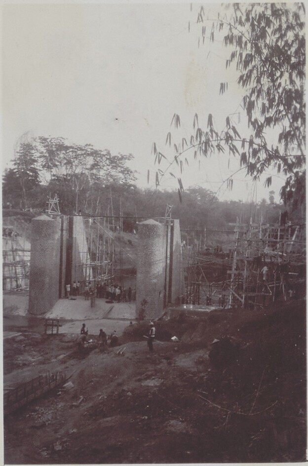 Foto uit een album over bouw van een sluis in Palembang