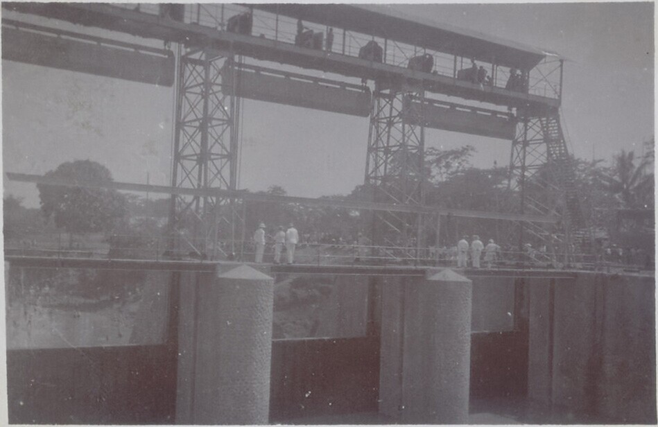 Foto uit een album over bouw van een sluis in Palembang
