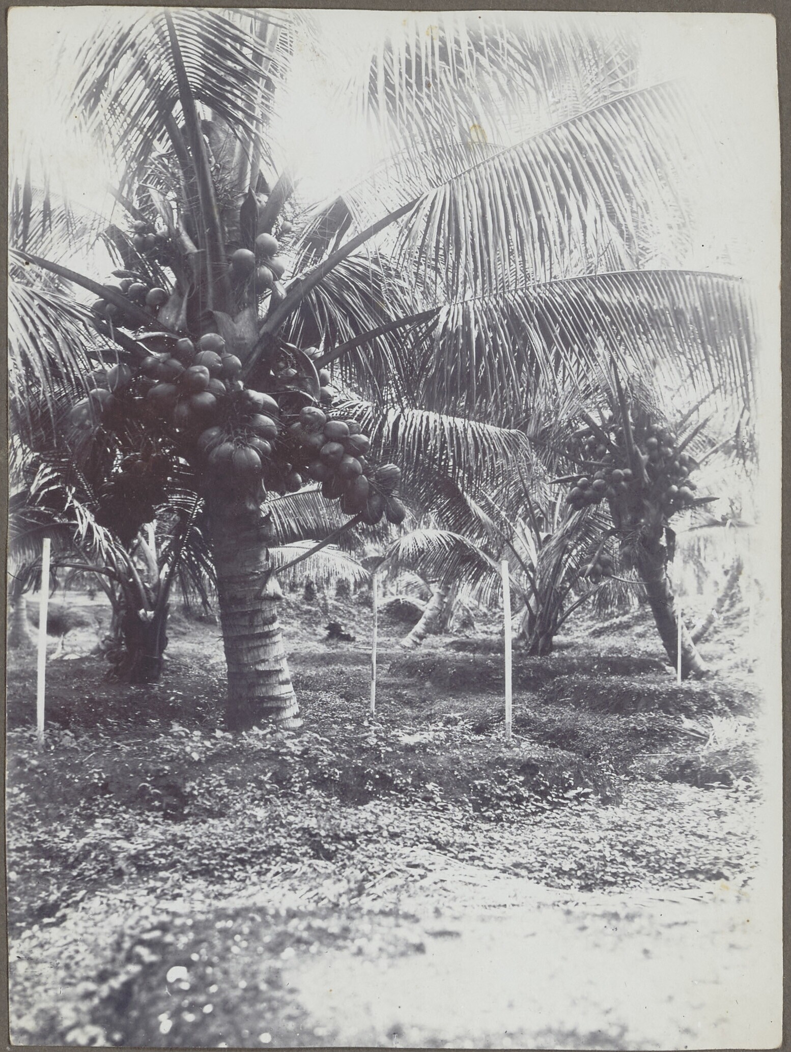 Een rijk in vrucht staande klapperboom in aanplant