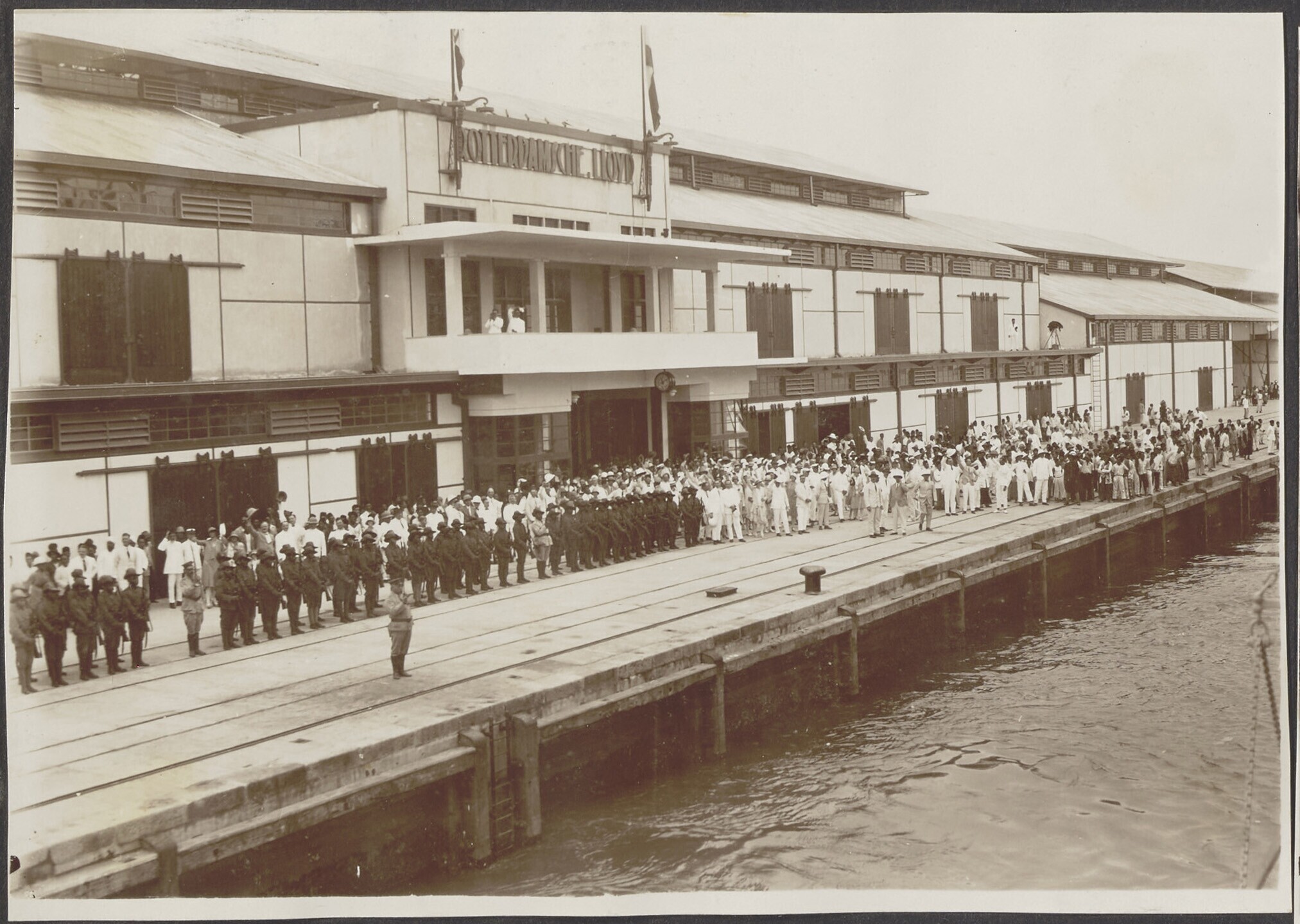 Mensen op de kade bij het vertrek van de Gouveneur, Medan