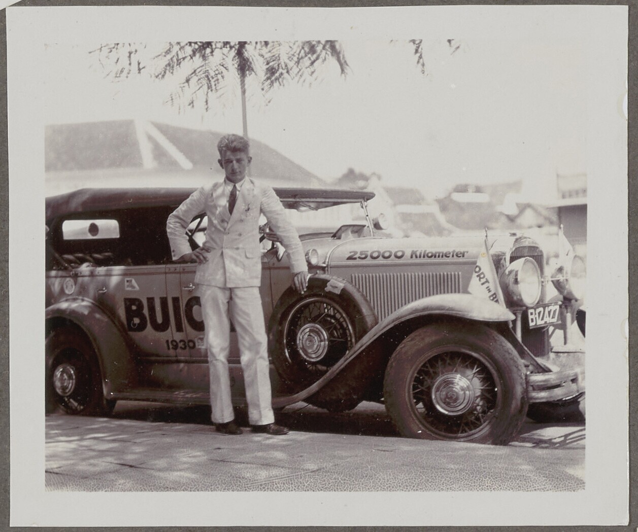Portret van een Europese man voor een Buick bij de non-stoprit 25000 KM Soerabaia Batavia v.v.
