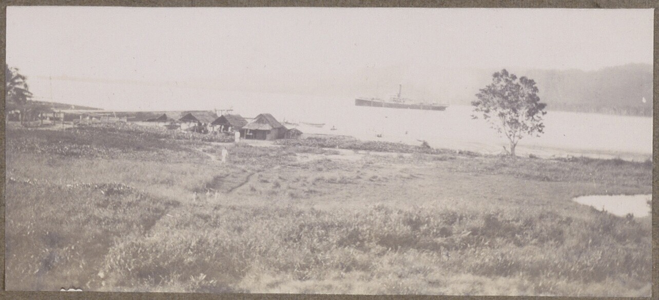 Zicht op gebouwen aan de kust van Beo, Noord-Sulawesi met daarachter schip in een baai