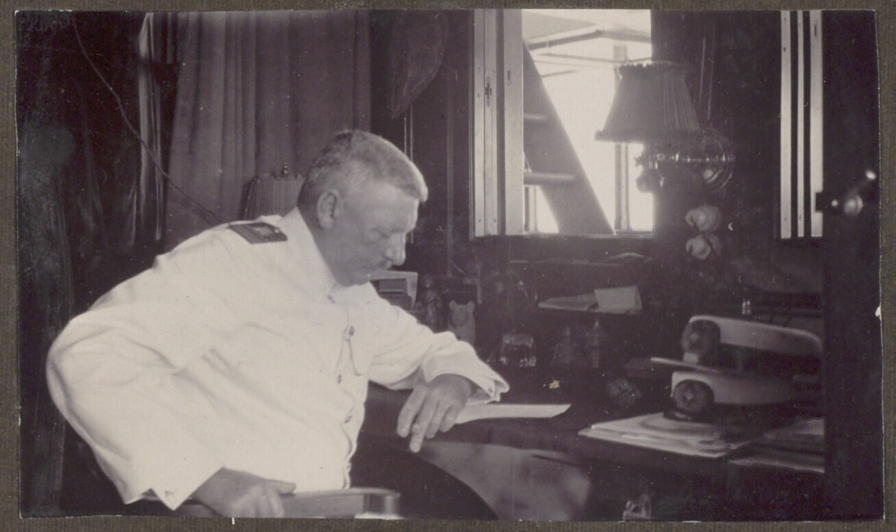 Kapitein Albert Hobma aan een bureau aan boord van stoomschip Pynacker Hordykaan